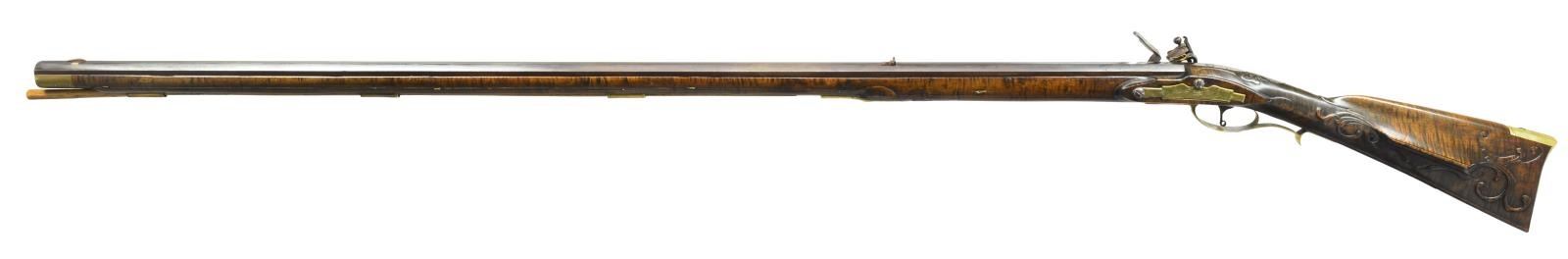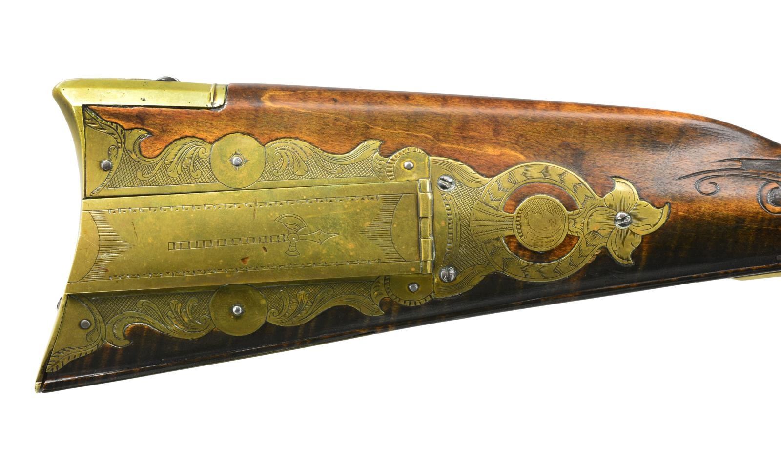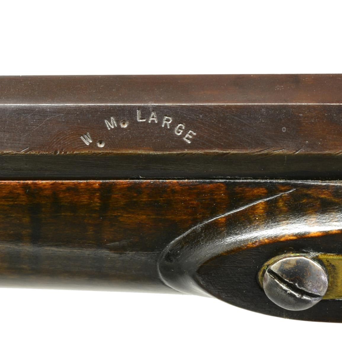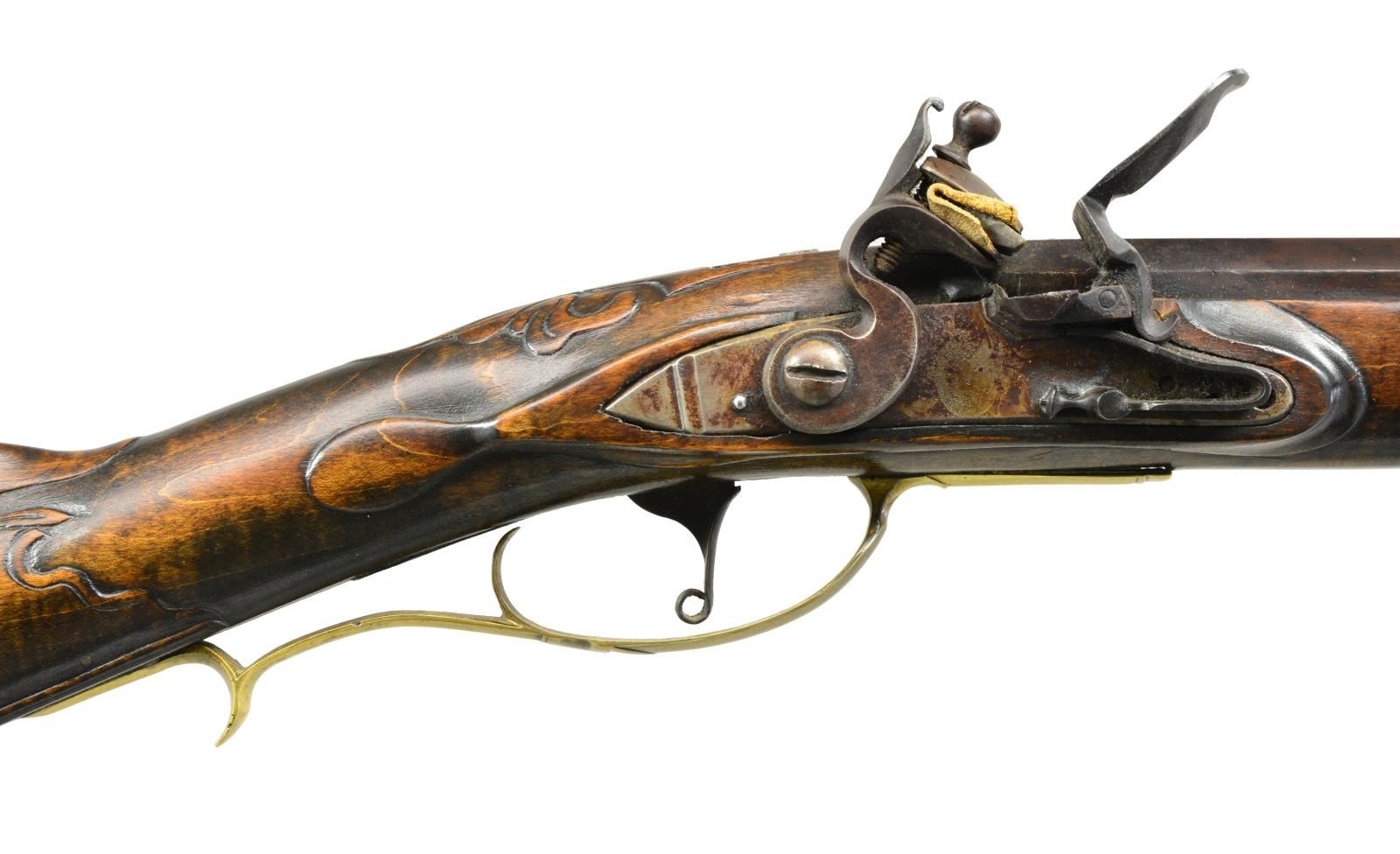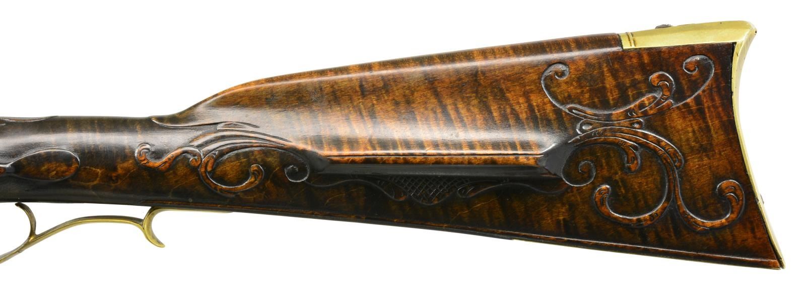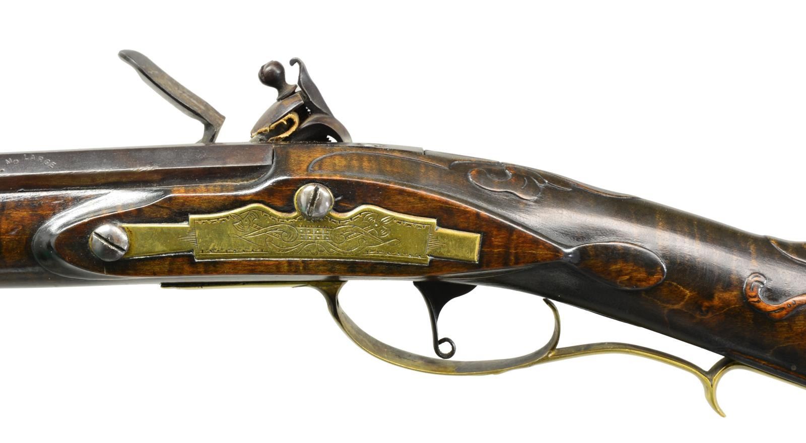 CONTEMPORARY FLINTLOCK RIFLE. Cal. 45. NSN. Bbl. 40 1/8" oct. measuring 7/8" across flats at muzzle. Left flat is marked w/ bbl. makers names "W. M. LARGE". Bill Large was a founding member of the National Muzzle Loading Rifle Association. He continued to make his bbls., which were prized for their shooting qualities into the 1980's. German silver blade front sight w/ fixed V notch rear sight. Unmarked trade lock. Bbl. & lock have an antiqued browned looking finish. Plain trigger. Key fastened full length curly maple stock. Right side of butt has rectangular lid pierced & segmented brass patchbox w/ daisy finial having full coverage engraving featuring Indian portrait & tomahawk. Other brass fittings include trigger guard, crescent buttplate, toeplate, nosecap & engraved sideplate. Extensive finely done vine type relief carving is found on either side of the cheekpiece as well as around the top tang lock & thimble areas. Ramrod channel has full length mouldered borders on both sides. Additional mouldered border is found runs from toeplate to trigger guard area. Hardwood ramrod held by faceted brass thimble & 3 faceted oct. brass pipes. Weight: 7 lbs., 10 oz. CONDITION: over 90% brown finish. Stock has very good finish showing a few sm. marks. Sound lock. Bore is bright w/ strong rifling. (01-18098/DS). ANTIQUE. $6,000-8,000.