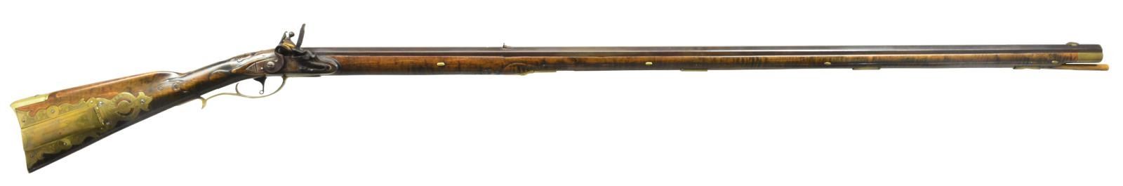 CONTEMPORARY FLINTLOCK RIFLE. Cal. 45. NSN. Bbl. 40 1/8" oct. measuring 7/8" across flats at muzzle. Left flat is marked w/ bbl. makers names "W. M. LARGE". Bill Large was a founding member of the National Muzzle Loading Rifle Association. He continued to make his bbls., which were prized for their shooting qualities into the 1980's. German silver blade front sight w/ fixed V notch rear sight. Unmarked trade lock. Bbl. & lock have an antiqued browned looking finish. Plain trigger. Key fastened full length curly maple stock. Right side of butt has rectangular lid pierced & segmented brass patchbox w/ daisy finial having full coverage engraving featuring Indian portrait & tomahawk. Other brass fittings include trigger guard, crescent buttplate, toeplate, nosecap & engraved sideplate. Extensive finely done vine type relief carving is found on either side of the cheekpiece as well as around the top tang lock & thimble areas. Ramrod channel has full length mouldered borders on both sides. Additional mouldered border is found runs from toeplate to trigger guard area. Hardwood ramrod held by faceted brass thimble & 3 faceted oct. brass pipes. Weight: 7 lbs., 10 oz. CONDITION: over 90% brown finish. Stock has very good finish showing a few sm. marks. Sound lock. Bore is bright w/ strong rifling. (01-18098/DS). ANTIQUE. $5,000-7,000.