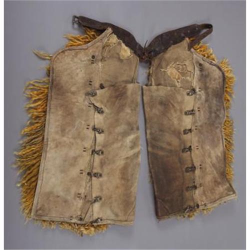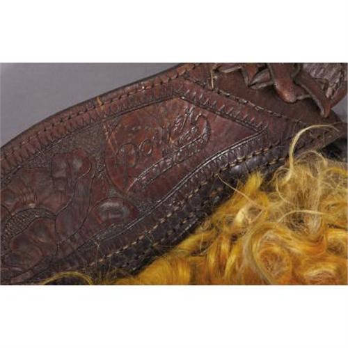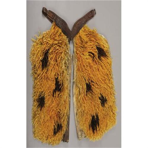 <B>SPECTACULAR WOOLIE CHAPS BY POWER OF PENDELTON, OREGON</B></I> - Orange and black spotted angora hair batwing style chaps; Tooled belt with large maker stamp; Hair is long and shiny and appears stable; Very showy pair. <BR><B>Condition: </B></I>Leather inside is worn; Canvas lining is well worn.<BR><BR><b>Shipping:</b> Clothing, Costumes & Jerseys (<a target="_blank" href="http://www.heritageauctions.com/common/shipping.php">view shipping information</a>)