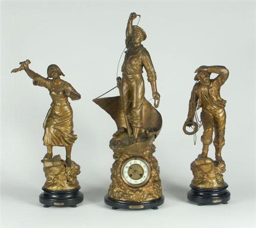 SPELTER MANTLE CLOCK AND GARNITURES: A nautical themed three piece French style figural bronze tone spelter mantle clock and garnitures on wood bases. The clock depicts a fisherman astride a small boat with the clock casing housed in a stylized wave, entitled, ''Cod Fishing'' with an enamel faced clock with winding key, unattributed, and untested, measures 30''H. One of the accompanying garnitures depicts a woman and is titled, ''Distress'', measures 24''H. The other depicts a man with a life ring and is titled, ''Rescue'', measures 24''H. Some chipping to patina noted.