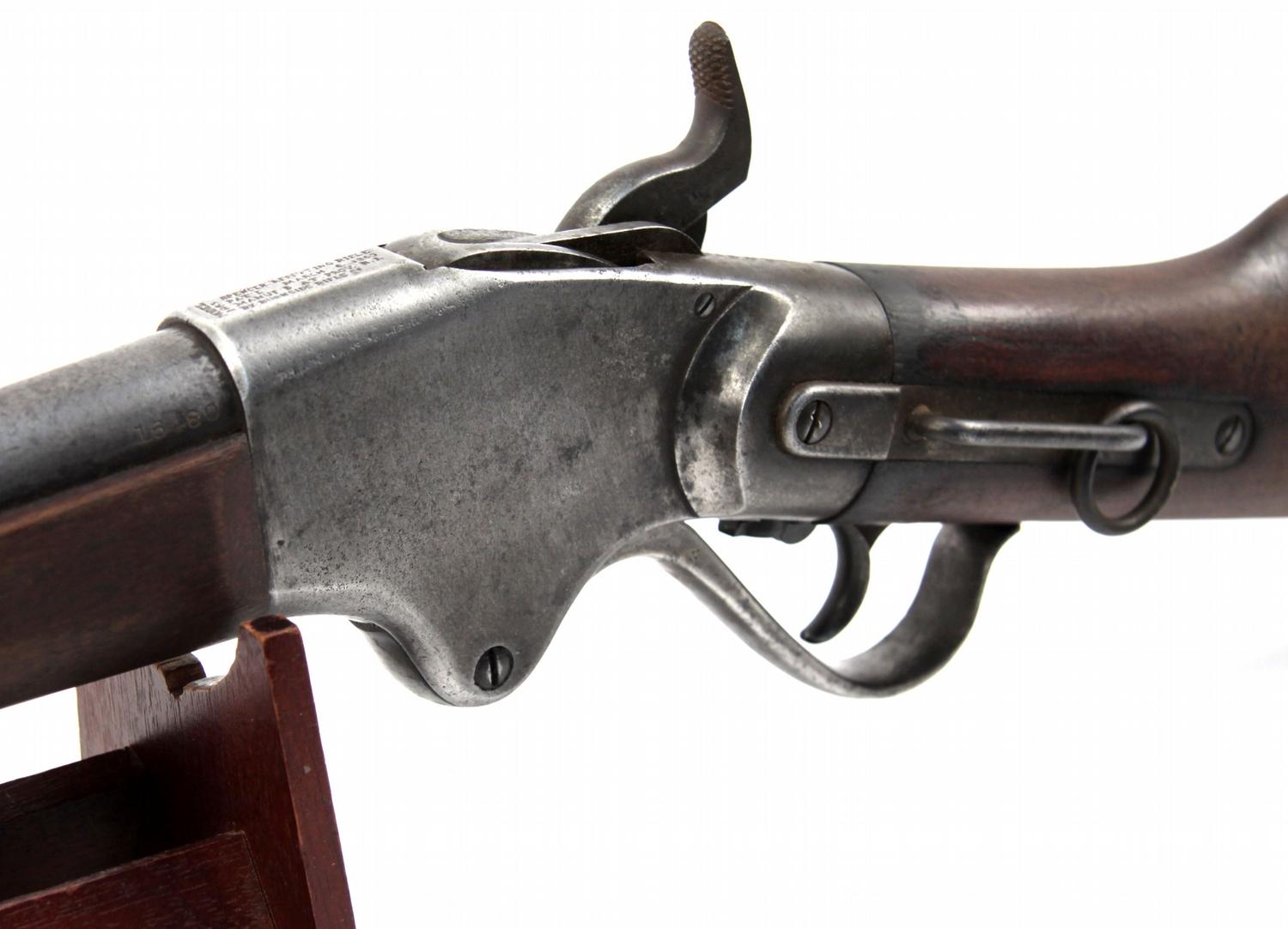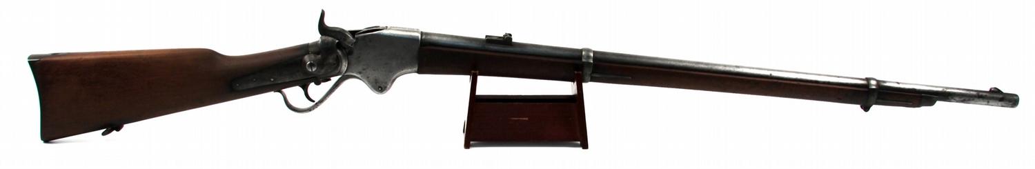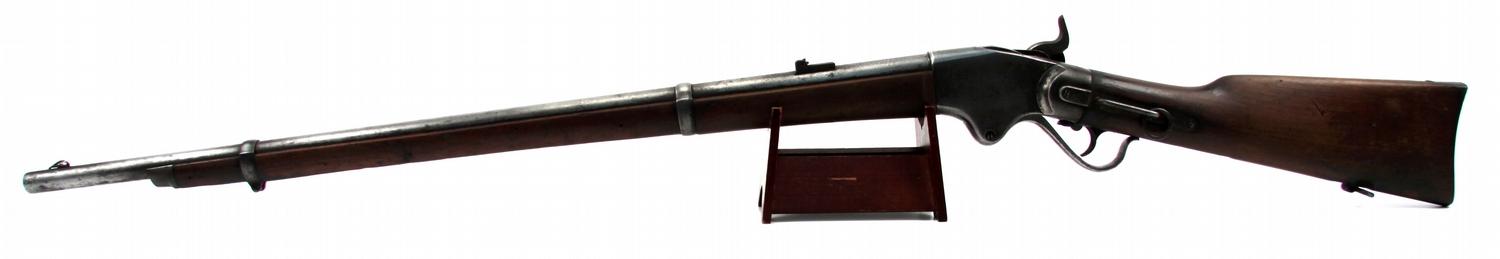 U.S. Army Spencer Model 1863 repeating .52 caliber rifle. Marked "Model 1863" and "Spencer Repeating Rifle Pat'd March 6, 1860 / Manuf' d at Prov R.I. by Burnside Rifle Co.". Stamped "U" on barrel rings. Saddle ring is intact, and surfaces have a smooth gray patina with evidence of being cleaned at one time. Stock is in very good condition, with no cracks or damage. Action is strong, and trigger is good. Bore has some rust and grime from storage, front sight appears repaired, magazine tube cap is missing, and cleaning rod is missing.