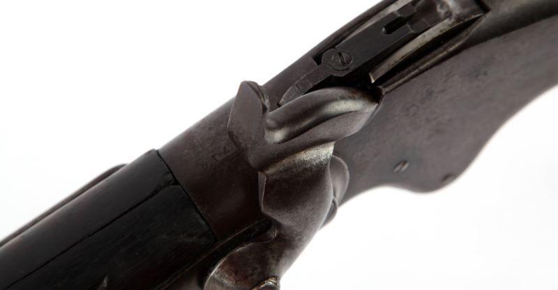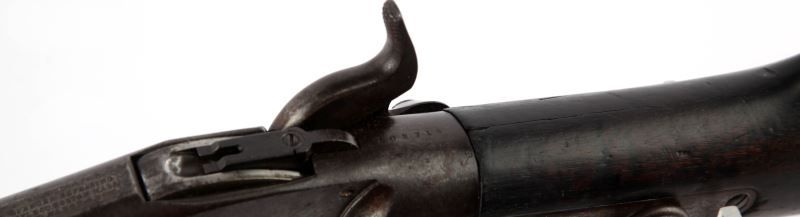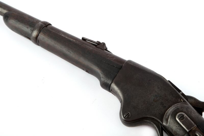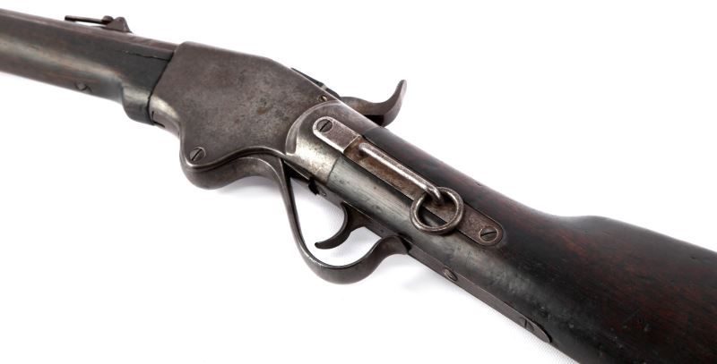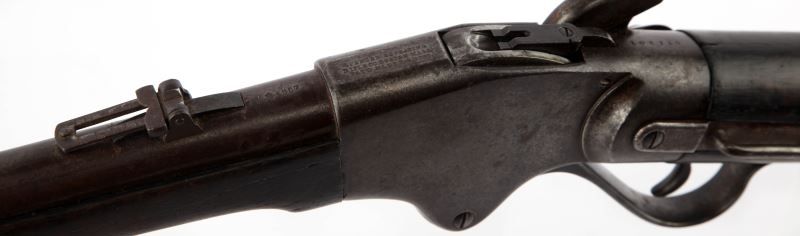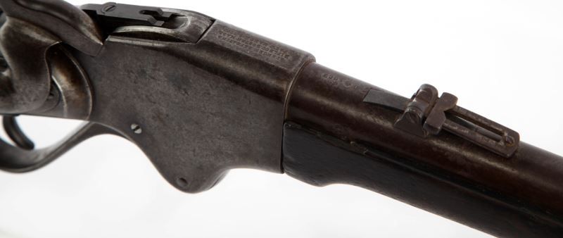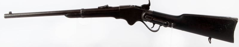 Spencer Moel 1867 saddle ring carbine. 20 inch barrel marked on top between sight and breech "M1867". Three line Spencer address & patent date on top of receiver. Saddle ring is present on left side. Bore is good, with some moderate pitting, but rifling remains visible. Mottled grey and plum patina on metal surfaces. Stock shows 2 inch fissure on left of fore end, 3.5 inch fissure directly behind receiver on grip of stock, and about 2.5 inch (well aged) crack just in front of butt plate. Wood is covered in a dark patina, over well aged service bruises. Action remains strong and smooth, with good tight clicks on hammer pull. Overall good condition. Caliber: .50 Serial #: 102716