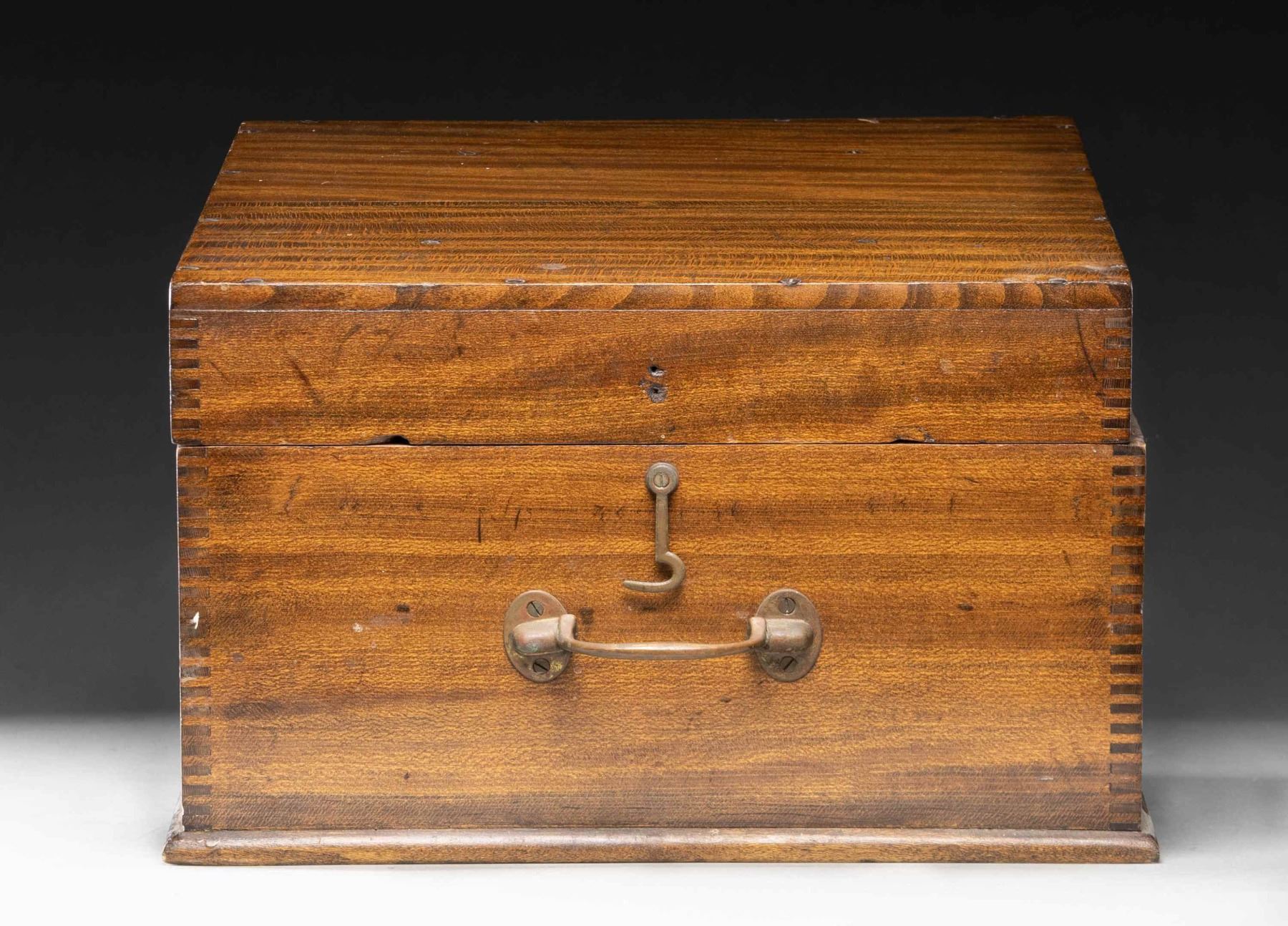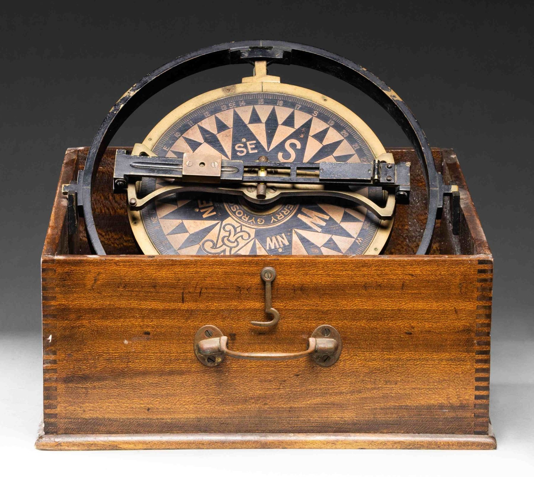 TRANSIT CHEST. Pelorus naval navigation compass mfg. by Sperry Gyroscope Co. Brass construction with black enamel finished brass outer ring and some small fittings. Housed within its original wood transit chest. CONDITION: good with black enamel finished parts retaining the majority of their original finish, showing some flaking and wear. Compass disc has acquired a pleasing mellow patina. Transit chest shows scattered marks and impressions with handling and storage, with a few chips on the lid. Lid hook ring is absent. (02-24526-6/MLW). NON-GUN. $200-300.
