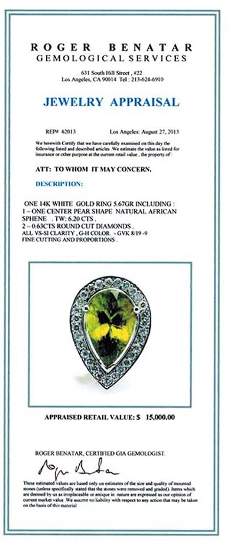 SPHENE 6.20CT, 14K WHITE GOLD RING 5.67GRAM / DIAMOND RD 0.63CT