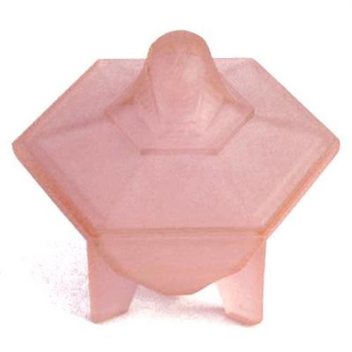 Known as Sphinx or King Tut, this Art Deco pink satin glass powder jar features a figural finial of a Sphinx head, while the jar is a cone shaped hexagon standing on three feet. This figural powder jar is shown and described on pages 44-45 in Whitmyer: Bedroom & Bathroom Glassware of the Depression Years. Beautifully executed with fine definition to the Sphinx features and an incredible Art Deco geometric shape. The jar with lid measures 5 x 5 1/4 inches with both the lid and jar in excellent condition