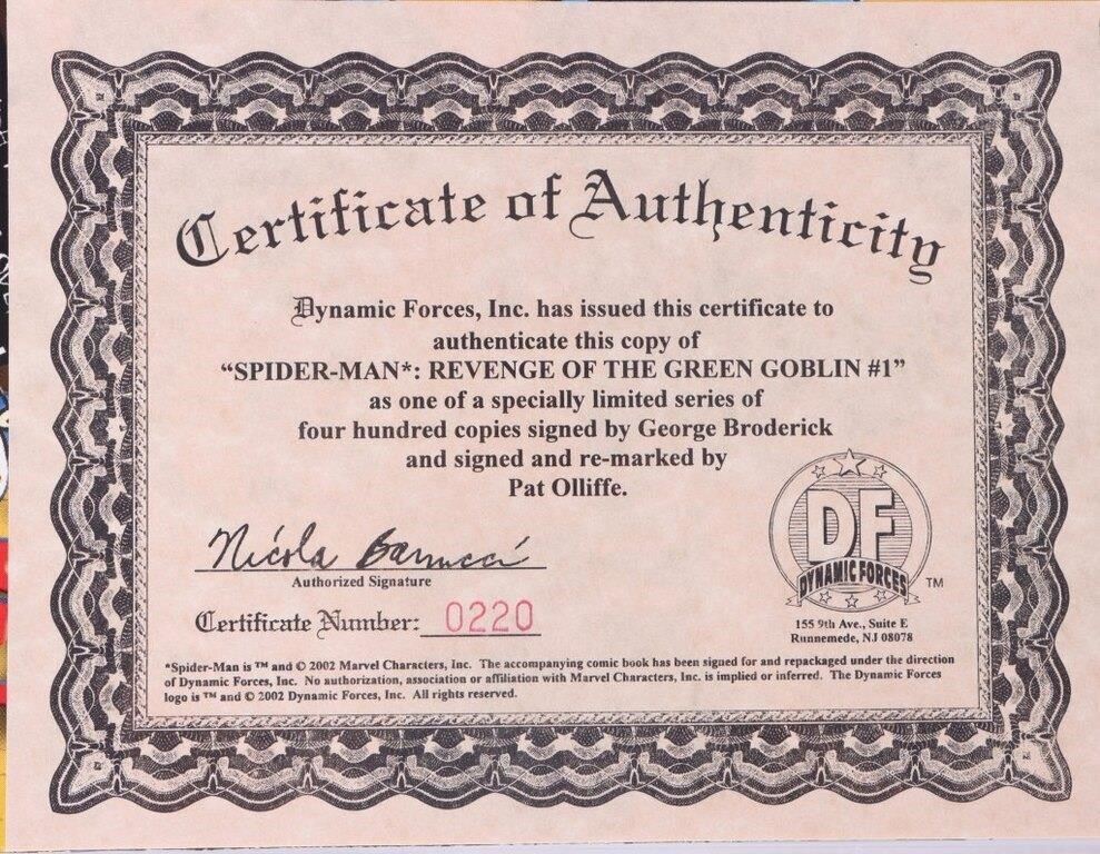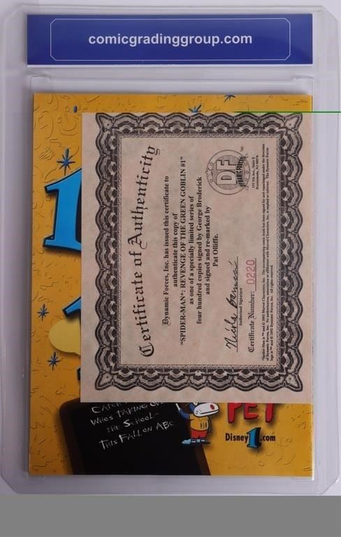 Spider-Man #1 Revenge of the Green Goblin comic signed by George Broderick (220/400) and Pat Olliffe. comes with certificate of authenticity and is graded 9.2 by CGG.