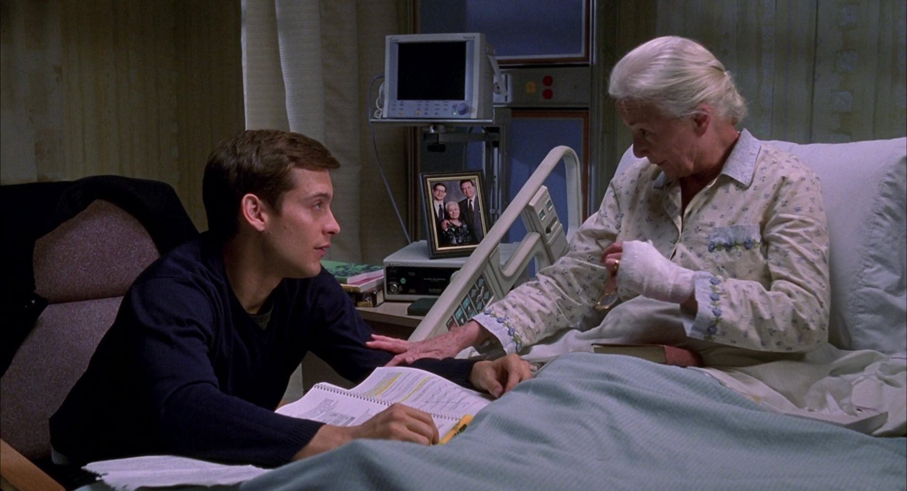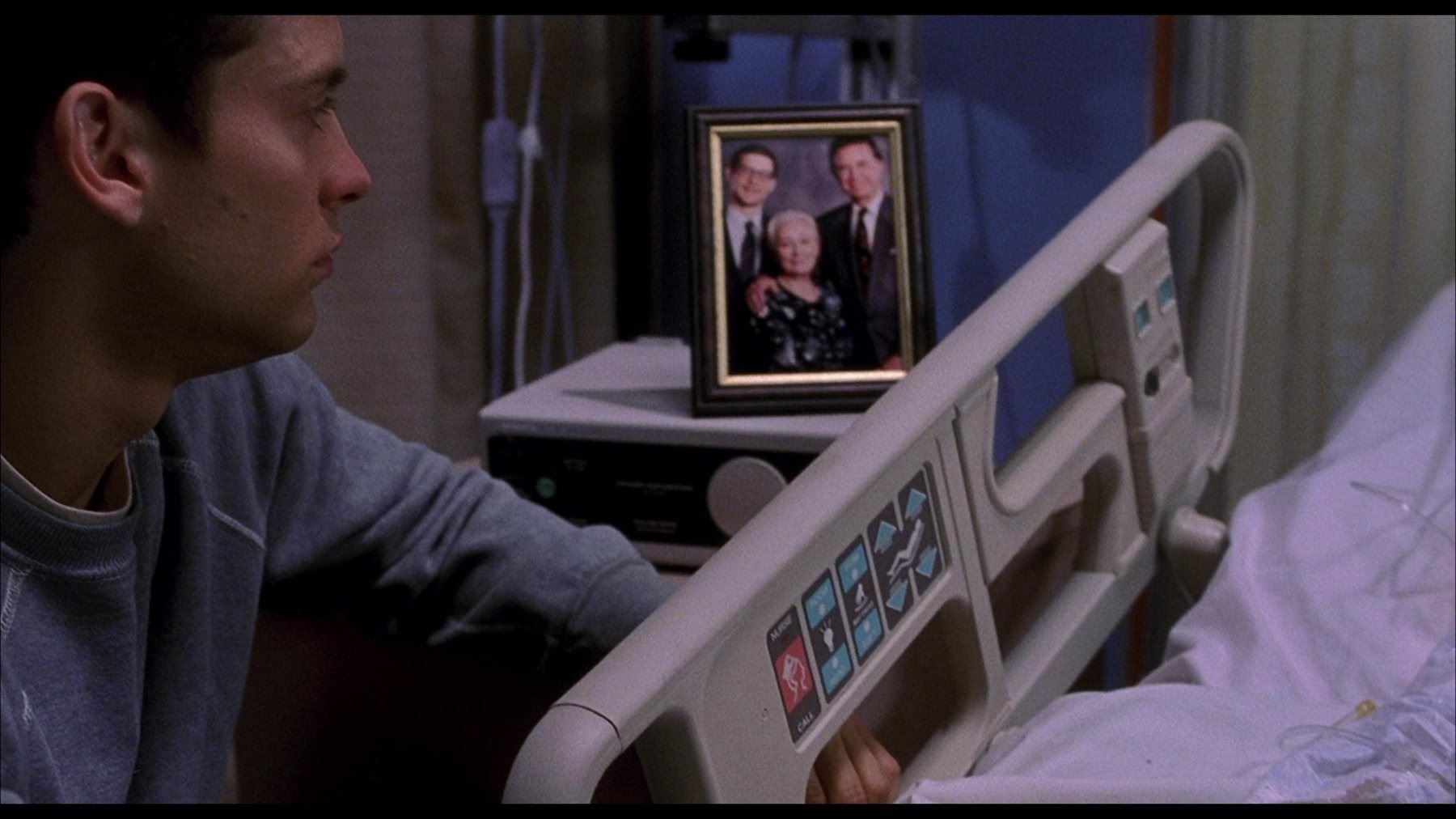 A Parker family photograph from Sam Raimi’s superhero film Spider-Man. Peter Parker (Tobey Maguire) kept a framed family photo next to Aunt May’s (Rosemary Harris) hospital bed after she was attacked by the Green Goblin (Willem Dafoe).