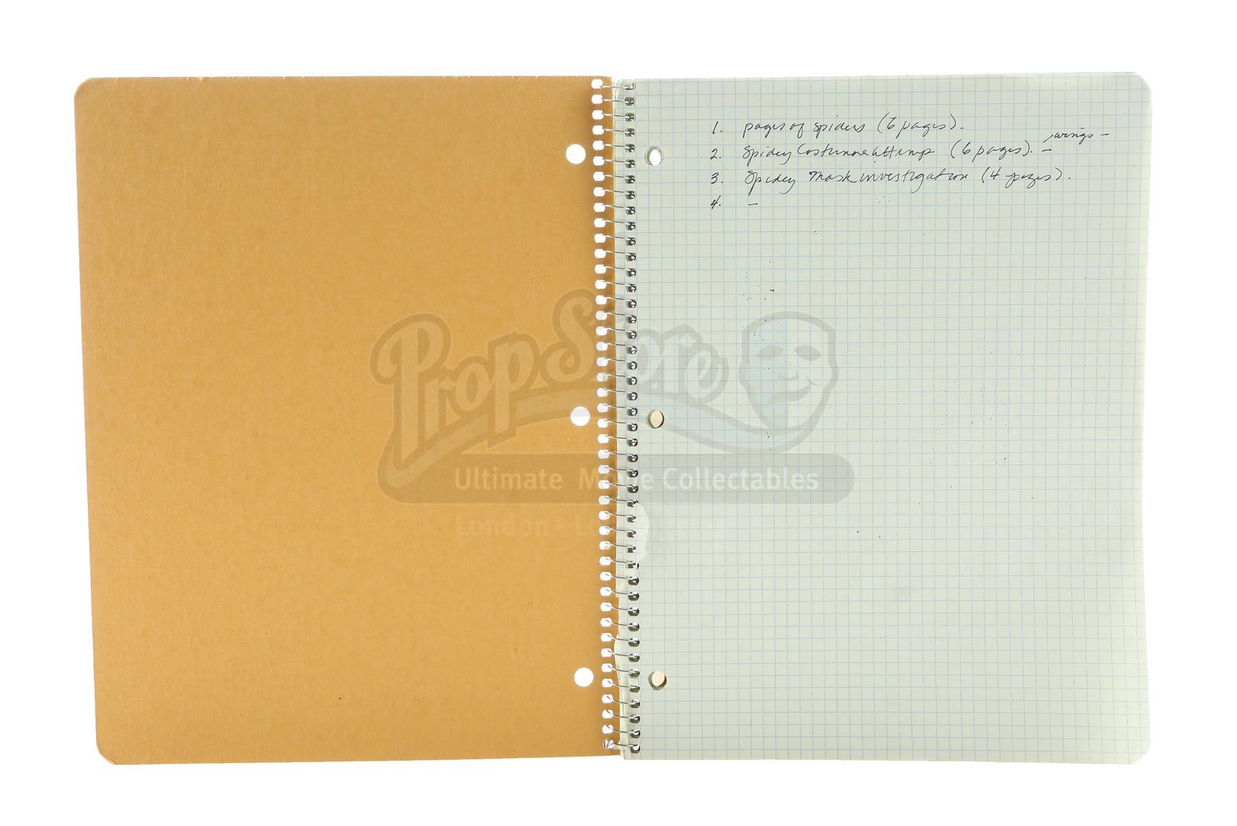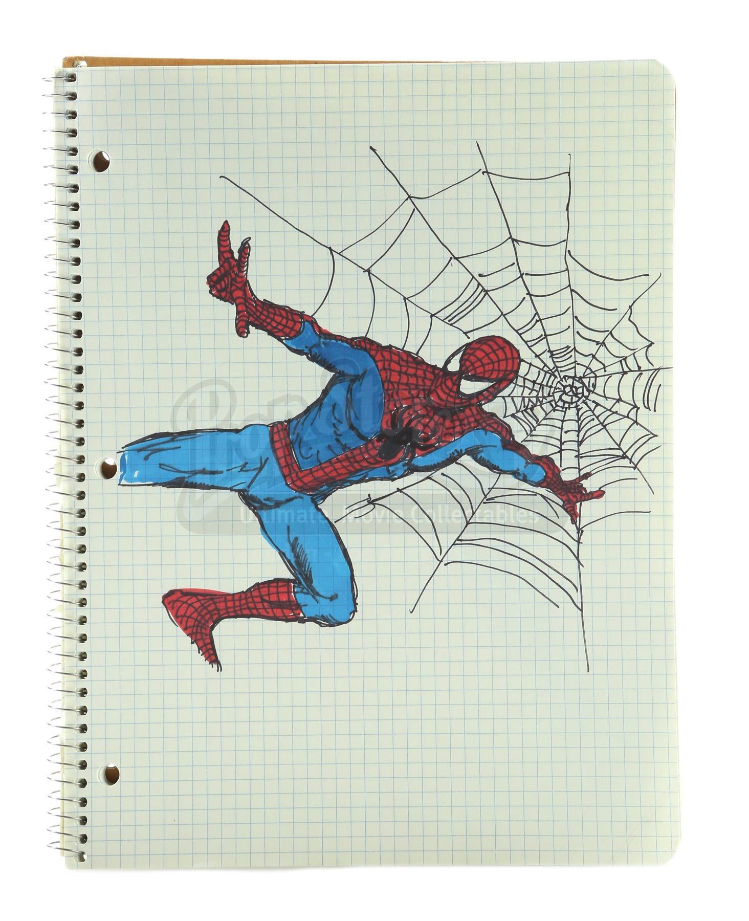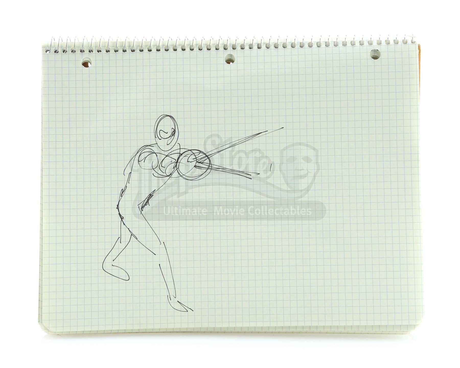 Peter Parker’s (Tobey Maguire) hand-drawn Spider-Man costume notebook from Sam Raimi’s superhero adventure Spider-Man. Peter drew a number of concepts for his Spider-Man costume upon discovering his new superpowers. This item is screen-matched to a close-up shot of Peter inking one of his sketches. The drawings are done by comic-book artist Phil Jimenez, whose hands were shot in close up for the shot.