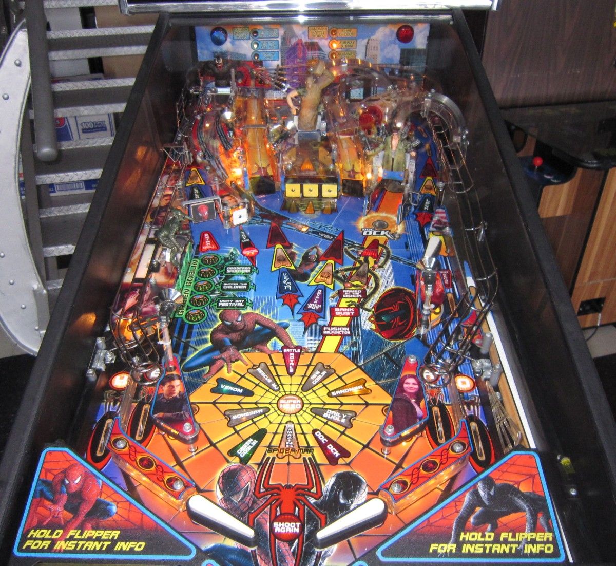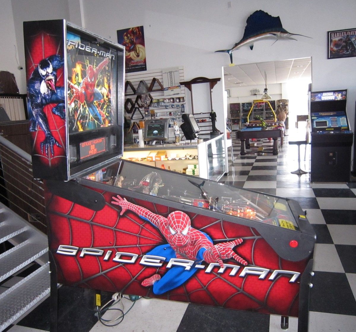 SPIDER-MAN, was designed by Steve Ritchie, Lyman Sheats, and the engineering staff at Stern Pinball, the pinball machine takes Spider-Man, Spider-Man 2, Spider-Man 3 and puts them all into one fast-paced pinball machine that will excite both operators and homeowners. In the SPIDER-MAN pinball machine, you are Spider-Man. Your goal is to defeat the villains from all three movies: Green Goblin from Spider-Man, Doc Ock from Spider-Man 2, and Sandman and Venom from Spider-Man 3. There are detailed, vibrant toys of each of the four villains on the playfield with an associated shot. Defeat all four villains and experience Battle Royale! Obtained from a local collector, this game is in nice condition and has been shopped by our techs.