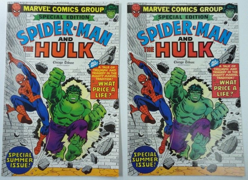 SPIDERMAN AND THE HULK SUPPLEMENT TO THE CHICAGO TRIBUNE. (2 COPIES - 20 PAGES EACH). THESE WERE INSERTED INTO THE SUNDAY EDITION OF THE CHICAGO TRIBUNE ON JUNE 8, 1980. ONE IS "NMT" THE OTHER IS CLOSER TO "FINE". THESE WOULD BE A GREAT ADDITION TO ANY SP