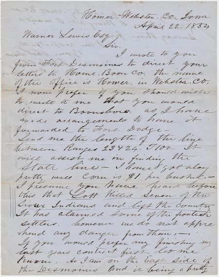 A.L.S. 2pp. 4to., Homer, Iowa, Apr. 22, 1854 by surveyor J. W Ellis to Warner Lewis. Ellis opens his letter discussing surveying business, then mentions a local murder of Indians: "I presume you have heard before this that [Henry] Lott killed seven of the Sioux Indians and left the country. It has alarmed some of the frontier. settlers. However we do not apprehend any danger from them...". Henry Lott's wife and son had been murdered by marauding Indians and all of his possessions stolen a few years earlier. In retribution, he tricked a Sioux chief and three of his sons into meeting him and, once they were intoxicated, Lott viciously murdered them and fled the region. Soon the Indians whispered that Lott was not only responsible for the death of their chief and his sons but also the pork and whiskey sold them by Lott had something to do with the epidemic which previously had killed some 75 of the braves. This seething anger culminated in the Spirit Lake Massacre in March, 1857 in which the Sioux killed 35-40 settlers and captured Abbie Gardner, who would later publicize the tale of her captivity.