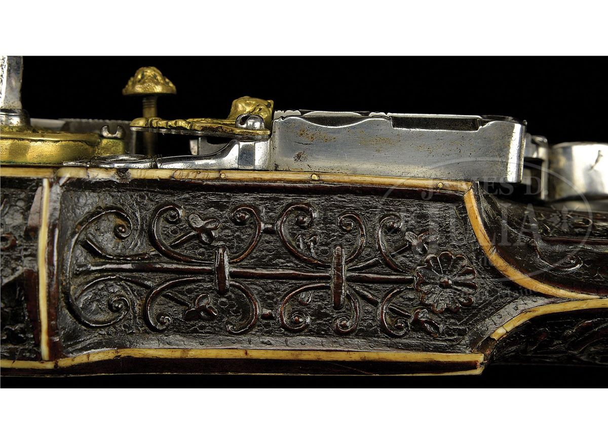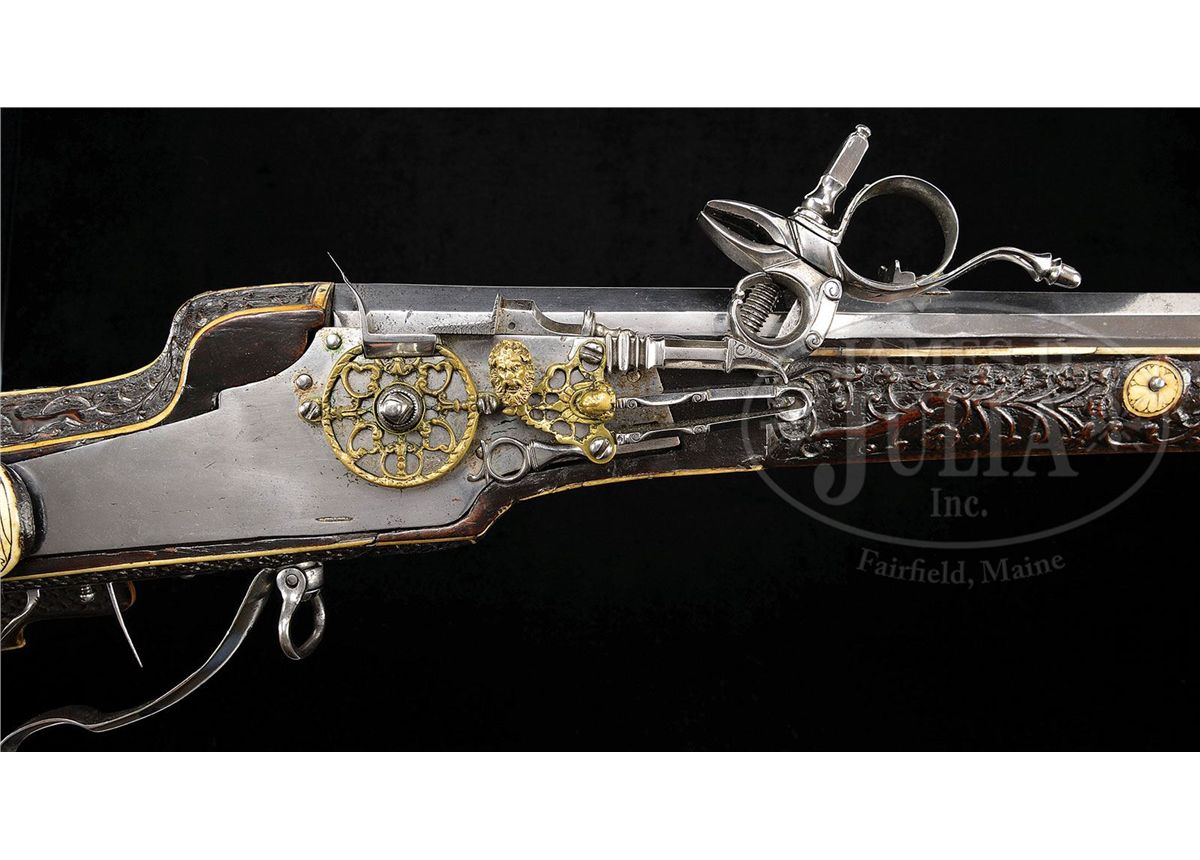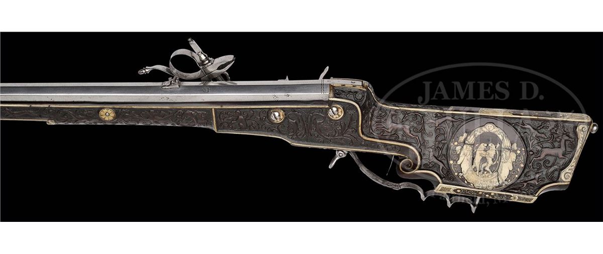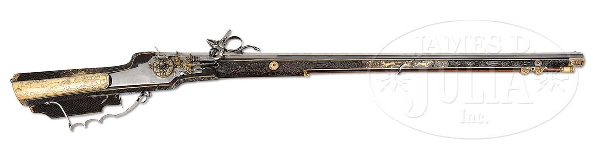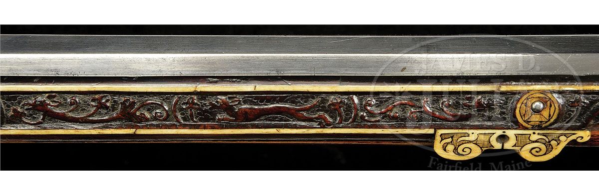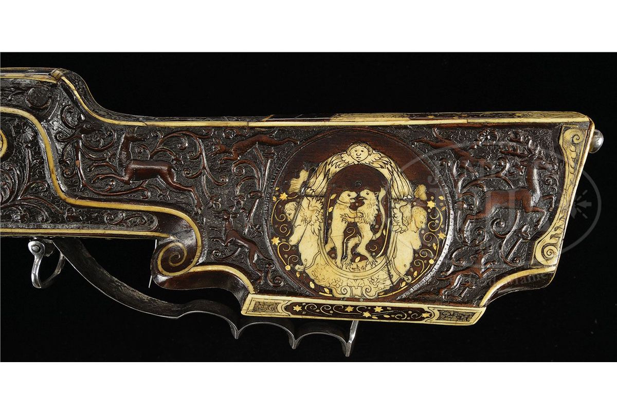 NSN. The quality of carving on this particular example makes it very likely that it is actually from the hand of the so-called "Meister der Tierkopfranke". There is a very long and detailed article describing the work of this master gun and stock maker in the Arms & Armor Annual published by Robert Held. In this article the greatest of all German arms scholars, Dr. Hans Schedlemann, illustrates many of the finest examples and discusses the enigma of these weapons at length. Most appear to have been made for the royal court of the emperor Ferdinand III. Some have extensive raised silver work on the bbls and locks, while others like this example, have relatively plain metalwork. This stock has raised carved stag, dogs, monkeys, foxes and terms, as well as dragon-heads spouting foliage from their mouths in the classic Tierkopfranke style. The trigger guard area is carved with fish scales in the Saxon style. Known Tierkopfranke rifles exhibit both white stag horn inlay as well as the extensive carving of this example. The patchbox is decorated with elaborate hunting scene featuring a longhorn stag with two does, a castle in the distance. The lock has a finely pierced gilded wheel cover, gilt bronze face forms the pan release, and gilt bronze putti face surmounts the dog and dog spring. Dog itself is finely chiseled and has an acorn finial reminiscent of the city of Augsburg. Oct bbl has a two leaf rear sight and brass fore sight and is deeply struck with the maker's mark "HIB" and inventory # "11" engraved on the breech. NOTE: All wheel locks by the Meister der Tierkopfranke are rare and desirable and the present example is particularly fine one, preserved in remarkable condition. PROVENANCE: Tom Lewis, Evergreen, CO. Collection of Dr. Douglas Sirkin. CONDITION: Metalwork is polished bright throughout. No replacements. Double set trigger functions perfectly and rifle retains original sling swivels. Stock is excellent. Virtually all inlays are original and intact. Carving remains extremely crisp for a 400 year old rifle. 4-49968 MZ8