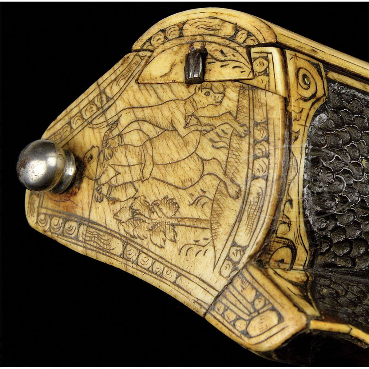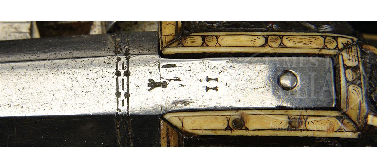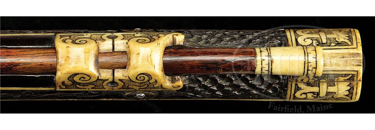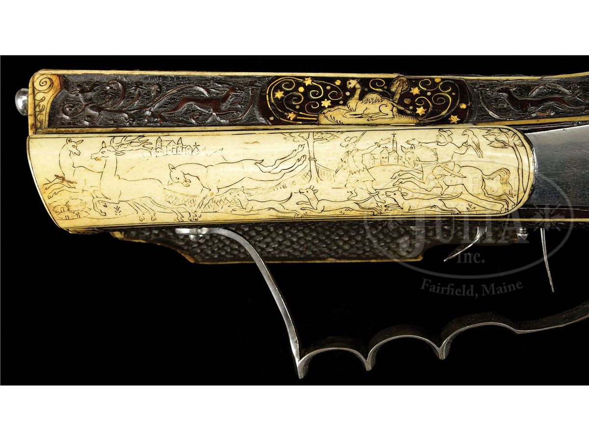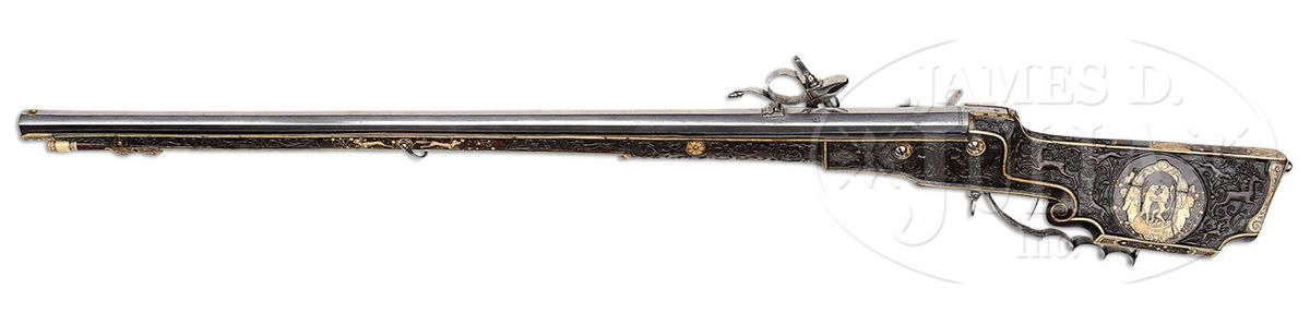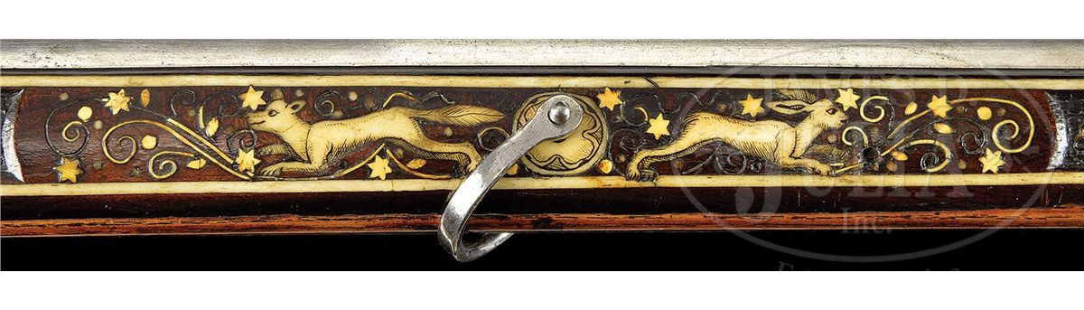 NSN. The quality of carving on this particular example makes it very likely that it is actually from the hand of the so-called "Meister der Tierkopfranke". There is a very long and detailed article describing the work of this master gun and stock maker in the Arms & Armor Annual published by Robert Held. In this article the greatest of all German arms scholars, Dr. Hans Schedlemann, illustrates many of the finest examples and discusses the enigma of these weapons at length. Most appear to have been made for the royal court of the emperor Ferdinand III. Some have extensive raised silver work on the bbls and locks, while others like this example, have relatively plain metalwork. This stock has raised carved stag, dogs, monkeys, foxes and terms, as well as dragon-heads spouting foliage from their mouths in the classic Tierkopfranke style. The trigger guard area is carved with fish scales in the Saxon style. Known Tierkopfranke rifles exhibit both white stag horn inlay as well as the extensive carving of this example. The patchbox is decorated with elaborate hunting scene featuring a longhorn stag with two does, a castle in the distance. The lock has a finely pierced gilded wheel cover, gilt bronze face forms the pan release, and gilt bronze putti face surmounts the dog and dog spring. Dog itself is finely chiseled and has an acorn finial reminiscent of the city of Augsburg. Oct bbl has a two leaf rear sight and brass fore sight and is deeply struck with the maker's mark "HIB" and inventory # "11" engraved on the breech. NOTE: All wheel locks by the Meister der Tierkopfranke are rare and desirable and the present example is particularly fine one, preserved in remarkable condition. PROVENANCE: Tom Lewis, Evergreen, CO. Collection of Dr. Douglas Sirkin. CONDITION: Metalwork is polished bright throughout. No replacements. Double set trigger functions perfectly and rifle retains original sling swivels. Stock is excellent. Virtually all inlays are original and intact. Carving remains extremely crisp for a 400 year old rifle. 4-49968 MZ8