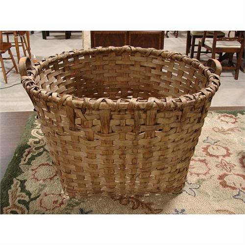 PRIMITIVE SPLIT-OAK FIELD BASKET WITH HANDLES. Shows some breaks at bottom. 14.5” H, 22.5” Dia.