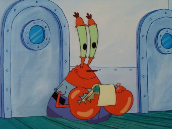 This original production art cel is from the SpongeBob SquarePants episode entitled The Squeaky Boots. This scene shows Mr. Krabs in the Krusty Krab writing in a notepad.Original Production Cel Art Overall Size (including mat and 12-field cel set-up): 11 × 15 © 2004 Viacom, Nickelodeon, SpongeBob SquarePants, etc. Cel episode number: 102Cel scene number: 143Certificate of Authenticity Excellent condition Here's what the Certificate of Authenticity has to say:
