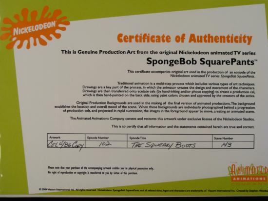 "This certificate accompanies an original hand-painted cel set-up used in the production of an episode of "SpongeBob SquarePants." Each one-of-a-kind set-up represents a slight change in position of the characters. When individually photographed and projected rapid succession, the images appear to move.