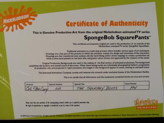 "This certificate accompanies an original hand-painted cel set-up used in the production of an episode of "SpongeBob SquarePants." Each one-of-a-kind set-up represents a slight change in position of the characters. When individually photographed and projected rapid succession, the images appear to move.