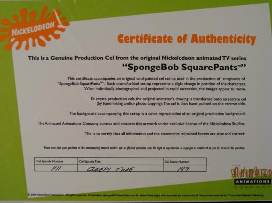 "This certificate accompanies an original hand-painted cel set-up used in the production of an episode of "SpongeBob SquarePants." Each one-of-a-kind set-up represents a slight change in position of the characters. When individually photographed and projected rapid succession, the images appear to move.