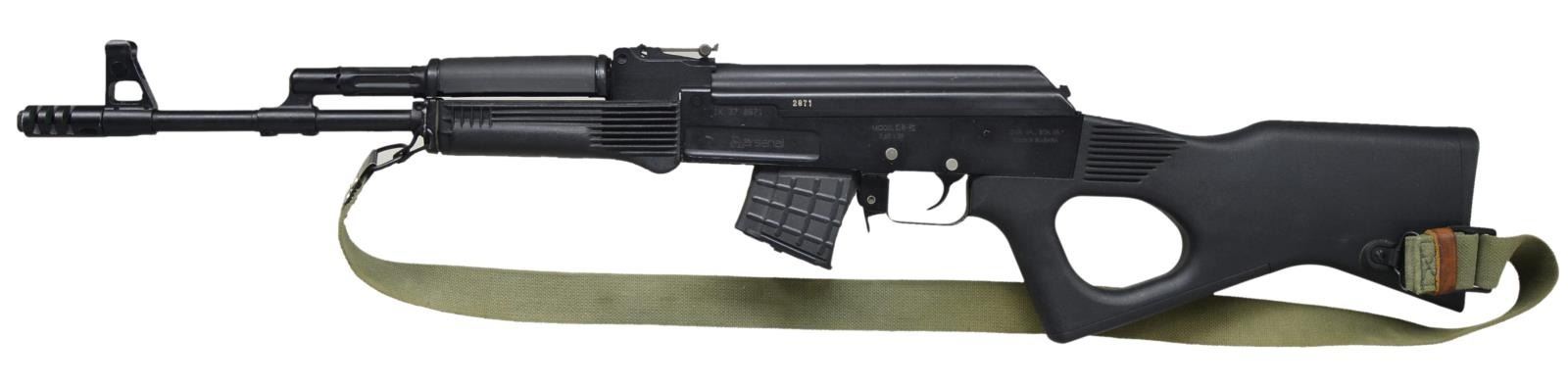 Cal. 7.62x39. S# IK372871. Bbl. 18". The name Arsenal Inc. is synonymous w/ some of the highest quality Bulgarian firearms mfg. worldwide. This example is a milled receiver sporter variant w/ black synthetic furniture & thumbhole stock. Traditional dark black painted finish on all exposed metal surfaces. The muzzle brake seems to be pinned to the bbl. & is included in the overall length. No bayonet lug. Protected post front sight & elevation adj. rear sight to 800m. Correct left side sling swivel corresponds w/ left side rear sling swivel on stock. Green canvas sling. MAGS: 1-5 rd. black plastic waffle pattern. CONDITION: finish on bbl. receiver & top cover is matching & complete, a few areas of rubbing indicate storage w/ other like firearms. Very little wear line on receiver below selector. Shiny bore w/ very strong rifling. Fire control mechanism appears to function correctly when cycled by hand. (21-701/JZ). MODERN. $500-800.