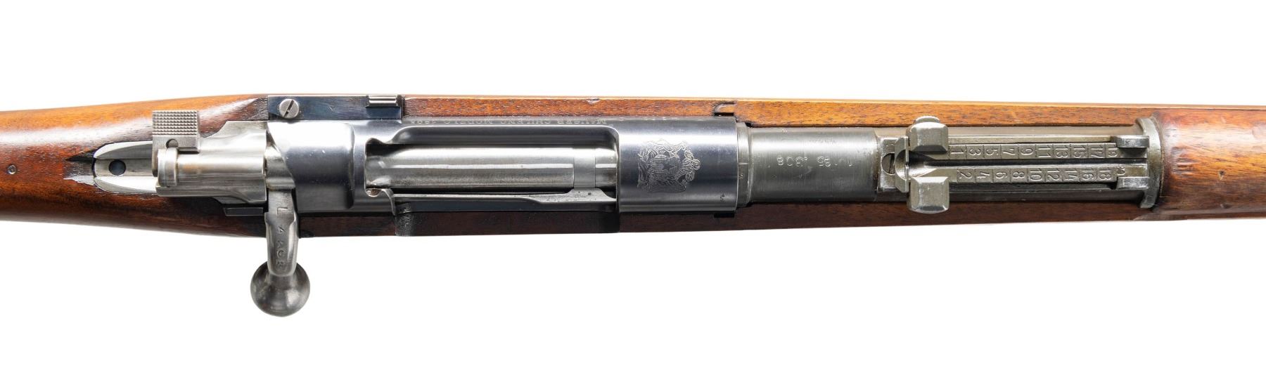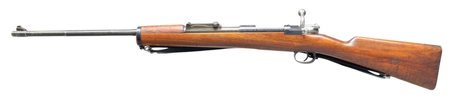 Cal. 308 Win. S# L4363. Bbl. 23". K98k style blade front sight. K98k style tangent rear sight graduated to 2000m. All visible matching numbers including turned down bolt handle. Receiver top has Chilean crest. Left side of receiver has Chilean 1895 & DWM markings. Bbl. top has "10.85 308" marking which denotes conversion to 308 Win. Consignor states this was by done by Bruce Clark in October 1985. Metal is a mix of different blue finishes. Cutdown walnut stock with 1902 dated Chilean cartouche, bottom mounted sling swivels & black nylon sling. CONDITION: stock has vacant hole on forend, scattered dings, scratches & handling marks. Bbl. is mostly a gray color with some finished over pitting on rear sight base, scattered edge wear & light oxidation. Other parts retain 85% bluing with some edge & handling wear. Action functions properly when hand cycled. Bright near excellent bore. (25-2842/MJC). MODERN. $200-300.