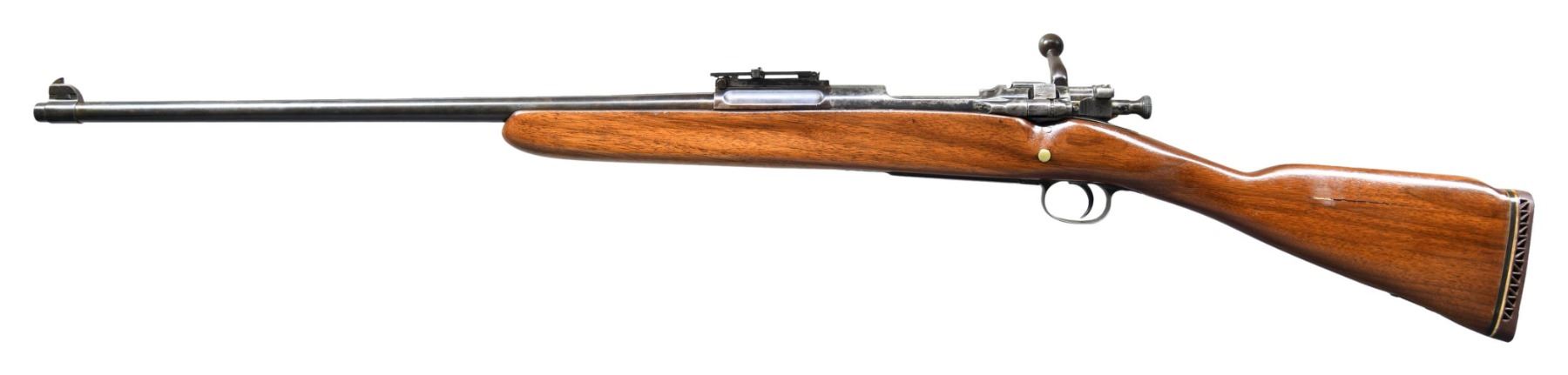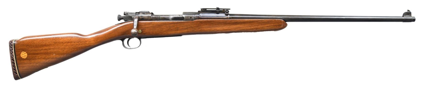 ACTION RIFLE. Cal. 30-06. S# 365189. Bbl. 24". Marked behind front sight "SA / flaming bomb / 4-09". Rear sight w/ small windage & elevation adjustment knobs. Blade front sight. Rifle produced in 1909. Straight down bolt handle. Rifle has been sporterized by shortening the straight grip walnut stock w/ the removal of the handguard, bbl. bands, butt swivel & buttplate. The stock is fitted w/ a Pachmayr ventilated recoil pad. Wood plug in right side of butt. Butt swivel has brass plate w/ "W.A.K." marking. CONDITION: buttstock w/ extensive crack on left side in cheek area has been modified at heel to create a slight Monte Carlo profile. Considerable wood has been removed during the remodeling process & stock given a glossy finish. Metal has traces of original blue & the case hardened receiver has a distinct mottled appearance. An attempt was made on top of the receiver ring to drill for a scope mounting block, leaving a shallow hole. Bore has frosted grooves w/ well-worn rifling. (25-2832/RW). MODERN. $250-350.