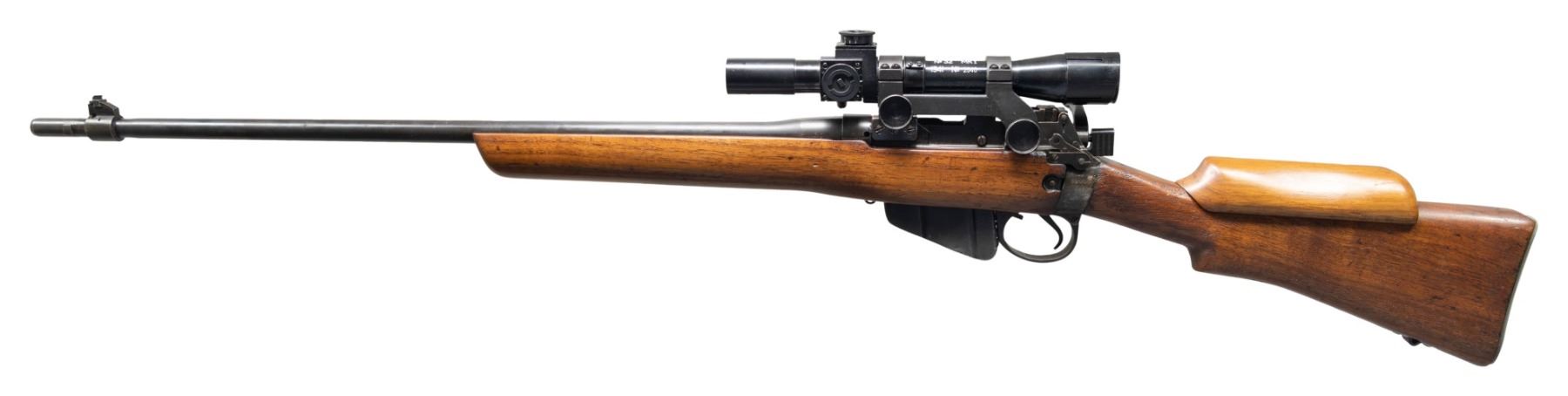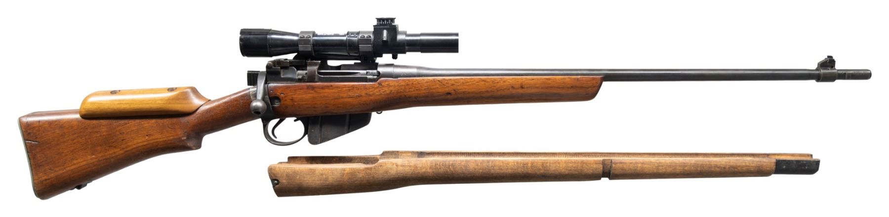 Cal. 303 Brit. S# F33766. Bbl. 25 1/5" with British sale proofs. Blade front sight with removed sight ears. Rifle is equipped with repro No. 32 MKI scope on repro mount. Scope has post reticle & very good optics. Matching numbers on socket & bolt handle. Other parts appear unnumbered or mismatched. Left side of receiver has No4 MKI & "T" markings. Left side of socket has "M47C" & "TR" markings with 1944 date. Base rifle appears to be a legitimate No.4 T sniper that was modified & thus no longer curio eligible. Metal has a mix of arsenal blue & Suncorite finishes. Cut down hardwood stock set with cheekpiece & faint number on top of wrist. Underside of butt has faint "S51" marking. MAGS: 1-10 rd. detachable & mismatched. UNATTACHED ACCESSORIES: repro leather scope cover & forend that appears to be newer production without metal hardware. CONDITION: refinished stock has added varnish with some dings & a crack ahead of buttplate tang. Metal shows overall fading to gray with an electropencil number on right side of socket possibly a Social Security Number, some scratches on socket, scattered light oxidation, edge wear & handling marks. Action functions properly when hand cycled. Good bore with strong rifling but some light pitting. (25-4412/MJC). MODERN. $500-800.