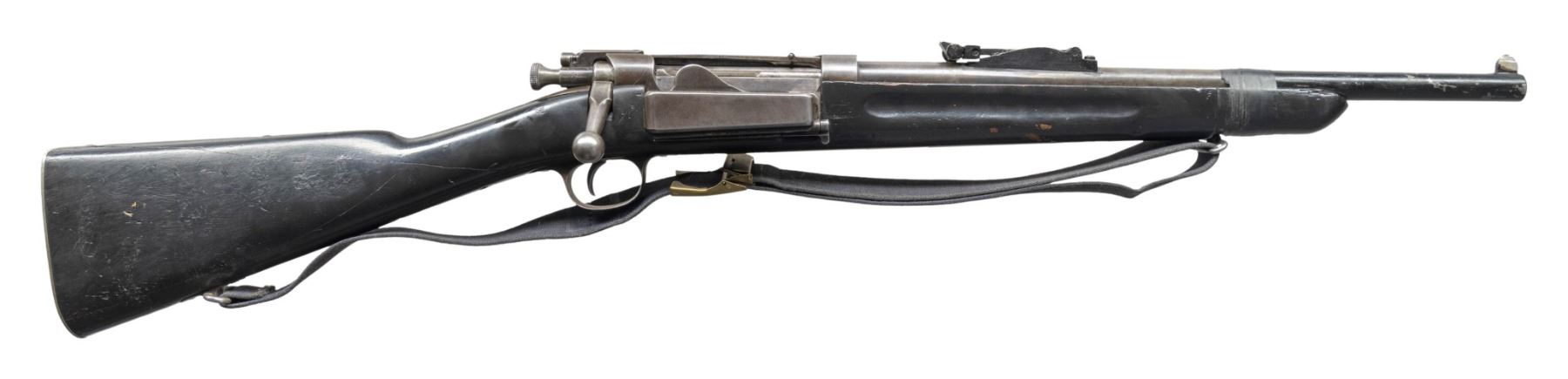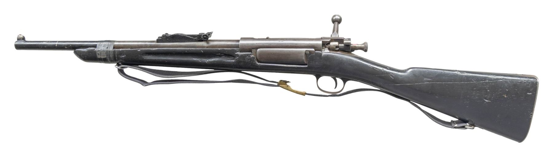 ACTION RIFLE. Cal. 30-40 Krag. S# 173178. Bbl. 16 3/4". Rifle has been shortened to a sporting configuration. Barrel cut to 17 3/4" & new front sight attached by welding. Model 1898 rear sight mounted on barrel. Lower band has been replaced w/ taped attachment. Smooth trap buttplate. Handguard has been removed. Shortened walnut stock has been given a gloss black coating. Shop made sling w/ brass buckle. CONDITION: stock has extensive repaired cracks & added wood filler on left side of forearm. Rear sight is painted black. Balance of metal turning gray w/ wear. Front swivel is sporting type. Bore is worn, but shiny w/ strong lands. (25-2787/RW). MODERN. $200-300.