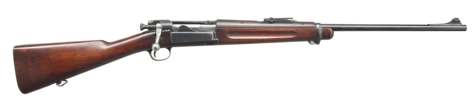 Cal. 30-40 Krag. S# 404363. 24 1/4" Bbl. cut down from 30" & fitted w/ Williams long front ramp holding Lyman white bead front sight. Military rear sight & hand guard retained. Unaltered 98 Krag action has box side mag. Walnut stock w/ plain steel buttplate has inspector’s mark “GLA 1902” on side. Stock has been cut down to 1 1/2" in front of rear band. CONDITION: fine as sporterized. Bbl. correctly crowned. Metal parts retaining over 70% of their original finish. Stock w/ most of its original finish. Fine bore, action is smooth. (20-4093/MGM). CURIO. $300-600.