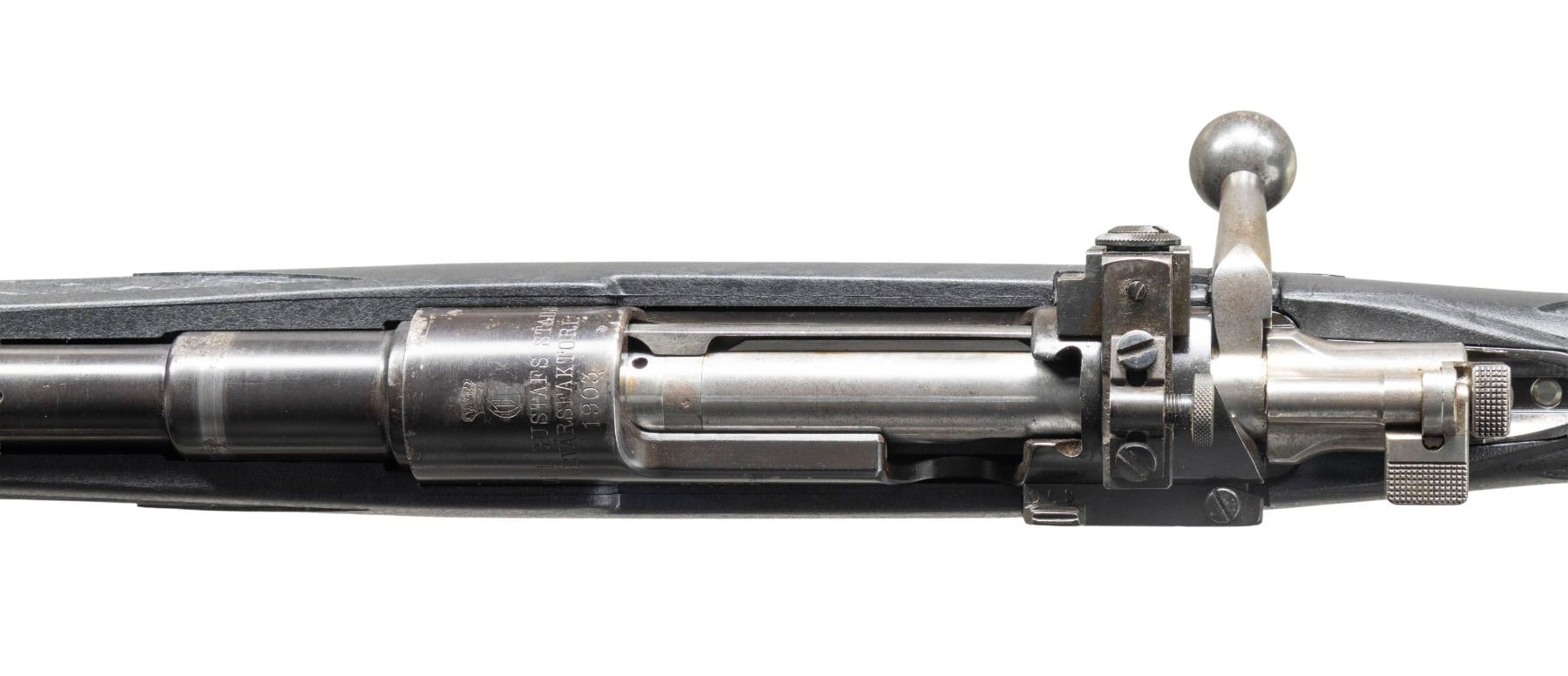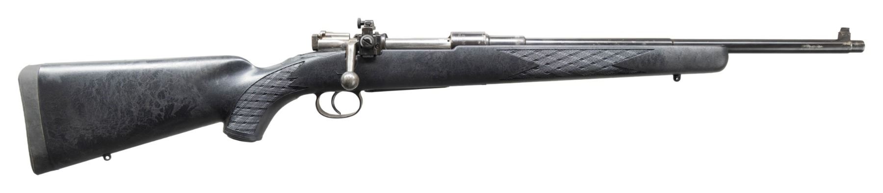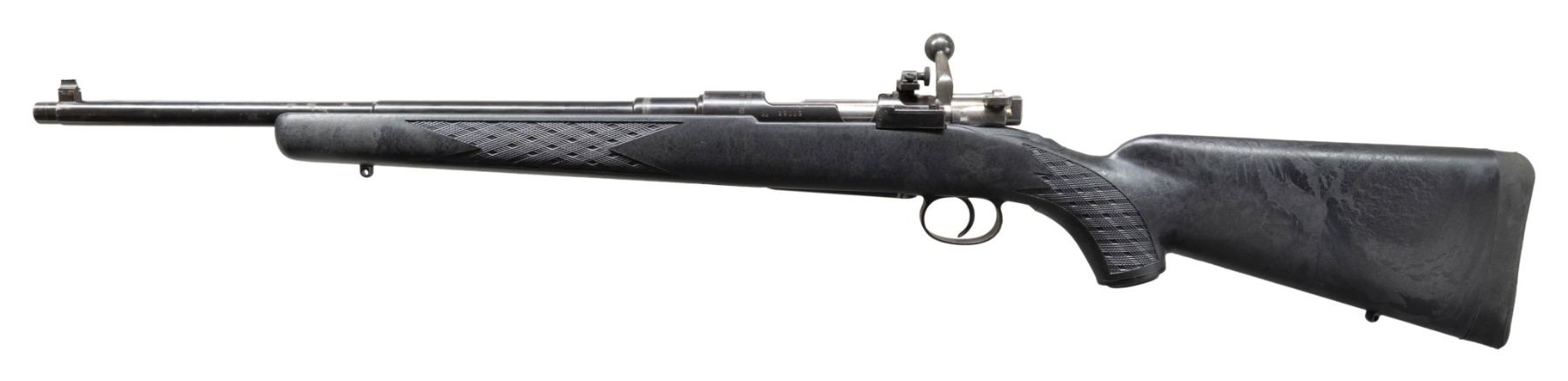 . Cal. 6.5x55. S# 22009. Bbl. 17 3/4". Aftermarket bead front sight. Receiver mounted Redfield aperture rear sight. Matching numbers on receiver, bolt parts & floorplate. Receiver ring has Carl Gustafs markings & 1903 date. Reblued finish. Ram-Line black synthetic pistol grip stock with bottom mounted sling studs & black recoil pad. LOP: 14". CONDITION: stock shows a few filled in areas with overall flaking & some handling marks. Metal retains 90% reblue with some edge wear, flaking, oxidation & spots of pitting. Action functions properly when hand cycled. Very good bright bore that appears to be counterbored at muzzle. (25-2849/MJC). MODERN. $250-350.