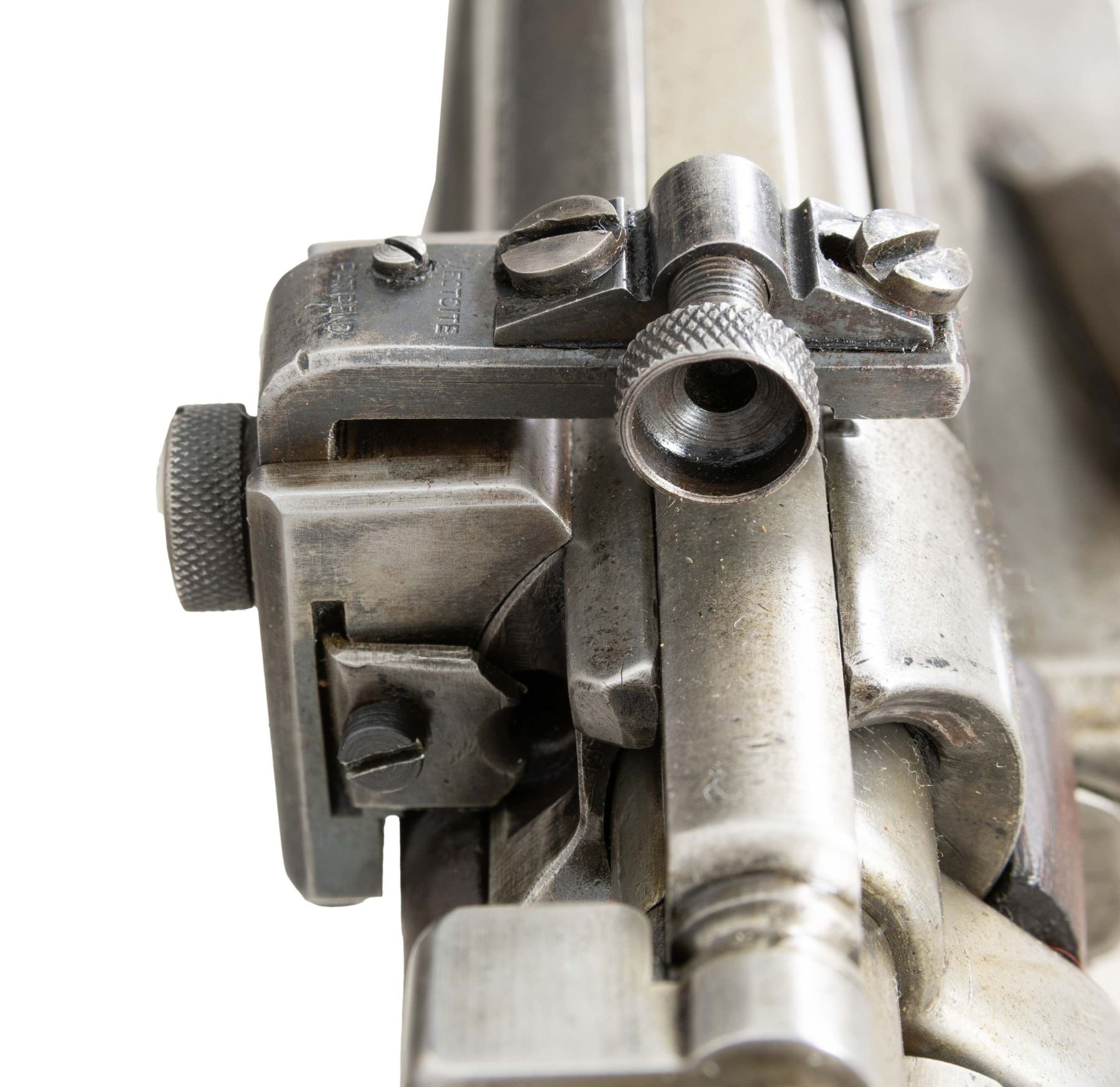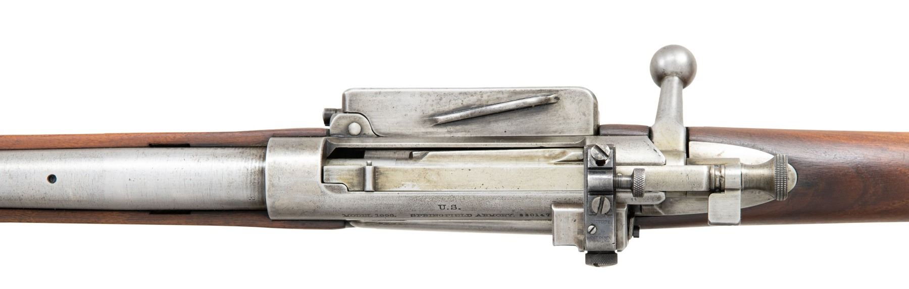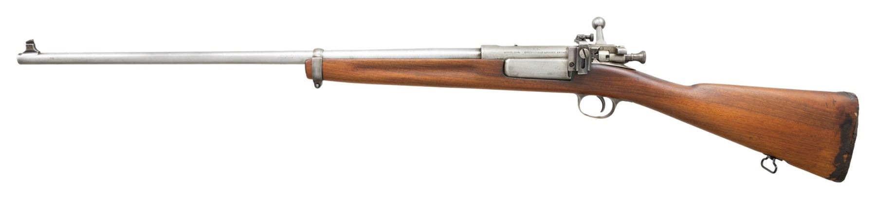 ACTION RIFLE. Cal. 30-40 Krag. S# 330147. Bbl. 25". Rifle has been sporterized but cutting barrel to 25" & relocating the original front sight. Rear sight is not present, leaving open screw holes. Rifle equipped w/ receiver sight marked "WECTCITE / PAT PEND". Magazine cutoff is not present. Most finish has been removed, leaving the metal parts in the white. The walnut stock has been shortened to the lower barrel band. Handguard is not present. Heavily sanded stock has remnants of rubber buttpad. Butt swivel replaced w/ one taken from SKS rifle. Front swivel bow is not present. CONDITION: the stock shows hobbyist workmanship w/ visible sanding marks & considerable loss of wood. Metal in the white is turning gray & patina w/ wear. Bore has worn lands, turning dark in the grooves. (25-2856/RW). MODERN. $150-250.