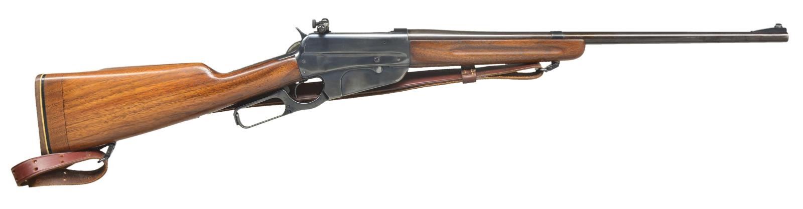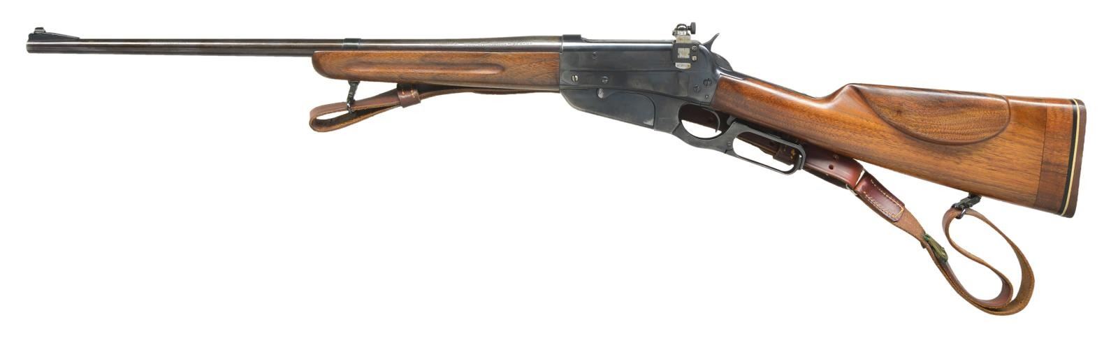 Cal. 30-40 Krag. S# 423797 (1930). Modified Winchester 1895 carbine w/out handguard, rear sight & saddle ring. Bbl. 22" w/ ramp mounted bead front sight & Redfield receiver sight. 2 Plugged holes where rear sight base sat. Sporterized walnut stock set has been w/ shortened forearm, added left side cheekpiece & 1 1/2" added section to butt including Pachmayr White Line pad. Brown leather military style sling on QD swivels & studs. CONDITION: good reblued metal finish w/ wear & marks. Very good sanded & refinished wood finish w/ repaired chip on left side of forearm. Very good bore. (22-2642/MD). MODERN. $400-600.