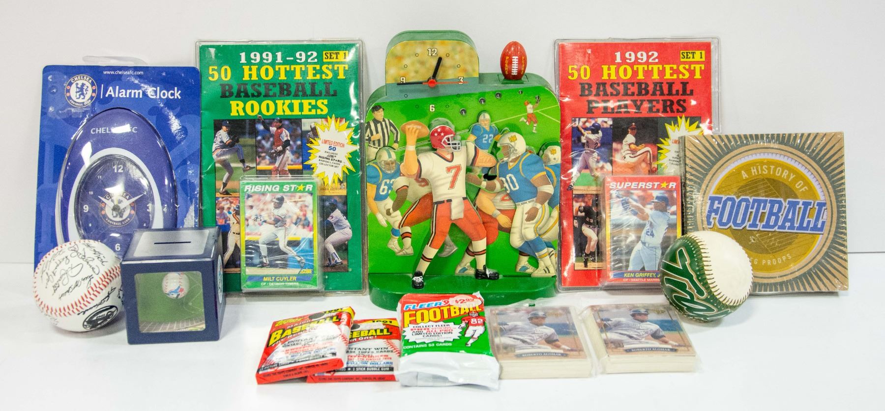 1961-1985 CALIFORNIA ANGELS TEAM SIGNED BASEBALL, EDMONTON TRAPPERS ORIGINAL BASEBALL, 1999 FUN-DAMENTAL TOO LTD. ORIGINAL FOOTBALL CLOCK "TESTED" NEW BATTERIES, SEALED CARD SETS SET 1 1991-1992, SEALED HISTORY OF FOOTBALL GREG PROUPS DISC, TORONTO