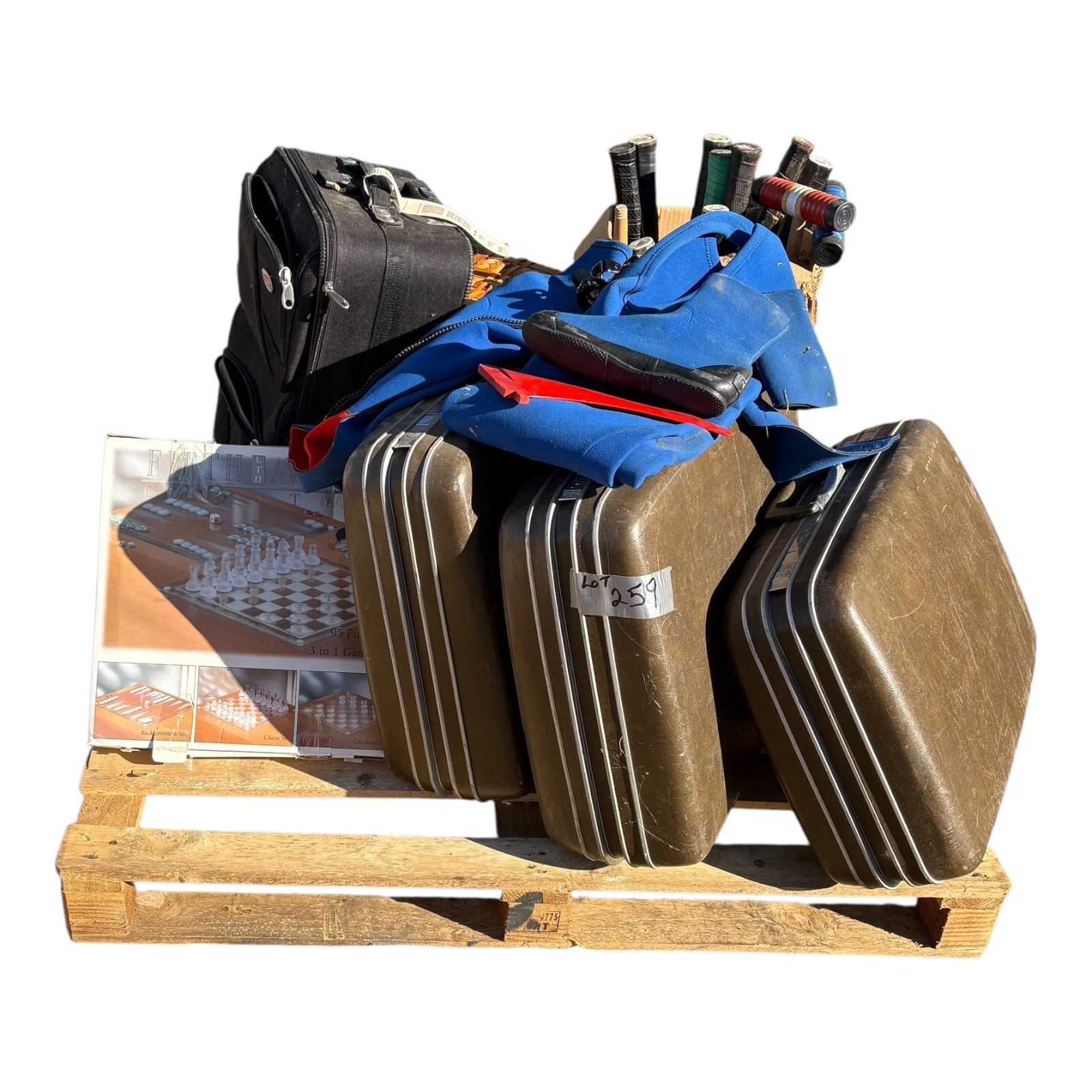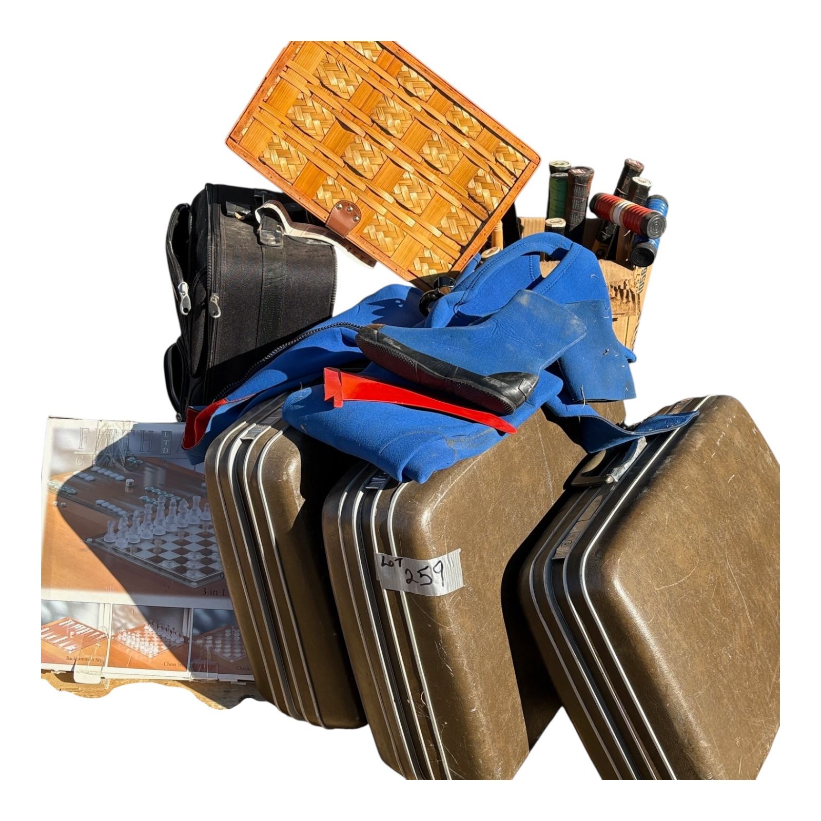 Crochet game, tennis rackets, chest set, picnic basket, scuba suit and suitcases