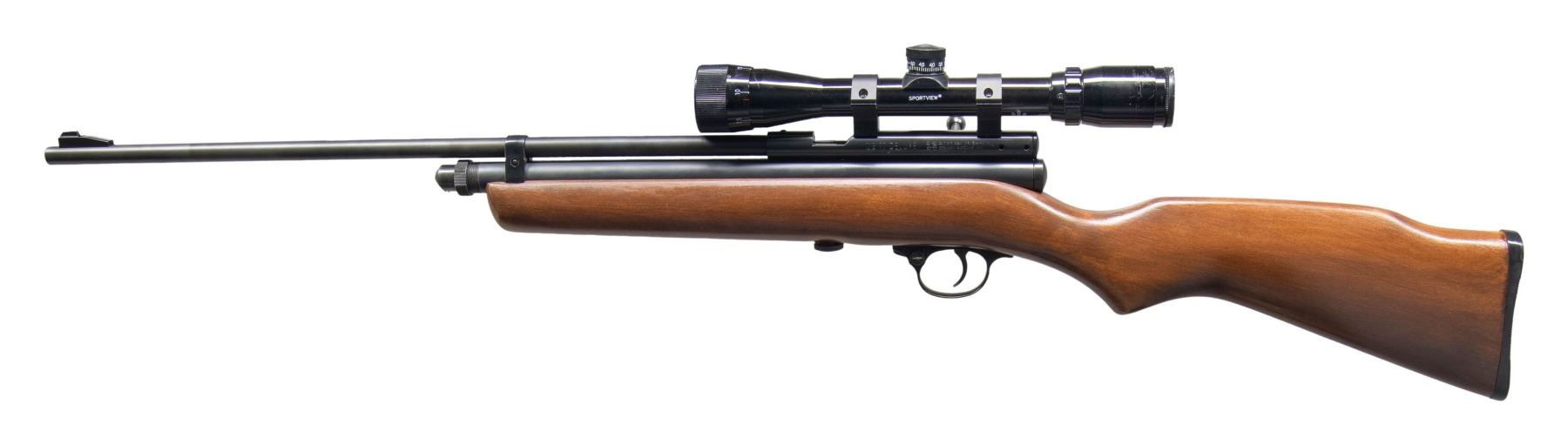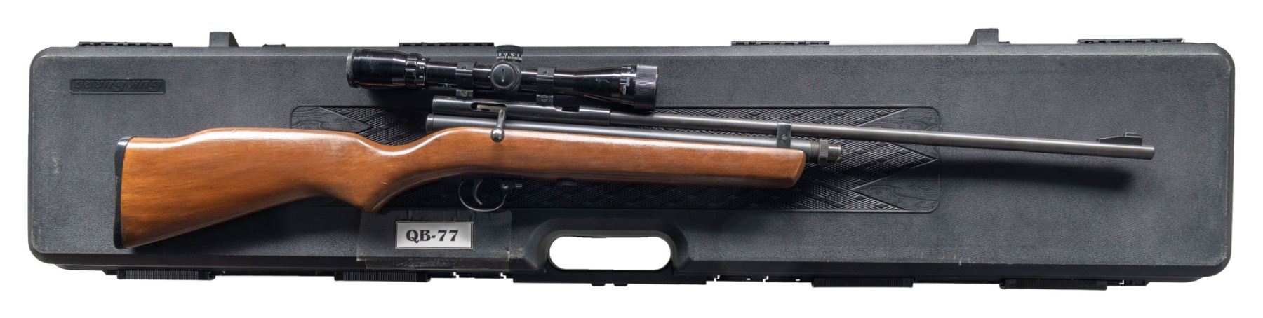 RIFLE. Cal. .177. S# 9307A00088. Bbl. 21 7/16". Model QB 77 Deluxe air pellet rifle mfg. for Sportsman Airguns Inc. Left side of the receiver is marked with the model designation, followed by the cal. designation. Metal components exhibit a blue finish overall, save for on the alloy trigger guard, which exhibits a black enamel type finish. 1-piece plain wood pistol grip stock with grooved black synthetic buttplate. Center of buttplate exhibits a data plate that reads "QB177U 9307A00088/ MADE IN SHANGHAI/ CHINA WITH PRIDE". Ramped blade front sight. Grooved receiver is fitted with a 3-9x32mm Sportview scope. UNATTACHED ACCESSORIES: generic black plastic hard case containing a partial felt lined Altoids tin of pellets. CONDITION: near excellent, with few superficial handling marks overall. Mirror bore. Stock shows a few light handling marks, but otherwise remains very good overall. (02-24391/MLW). NON-GUN. $200-400.