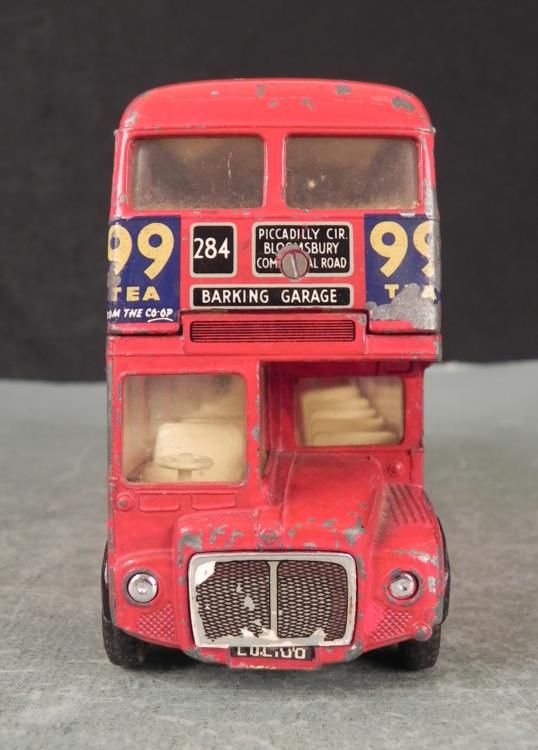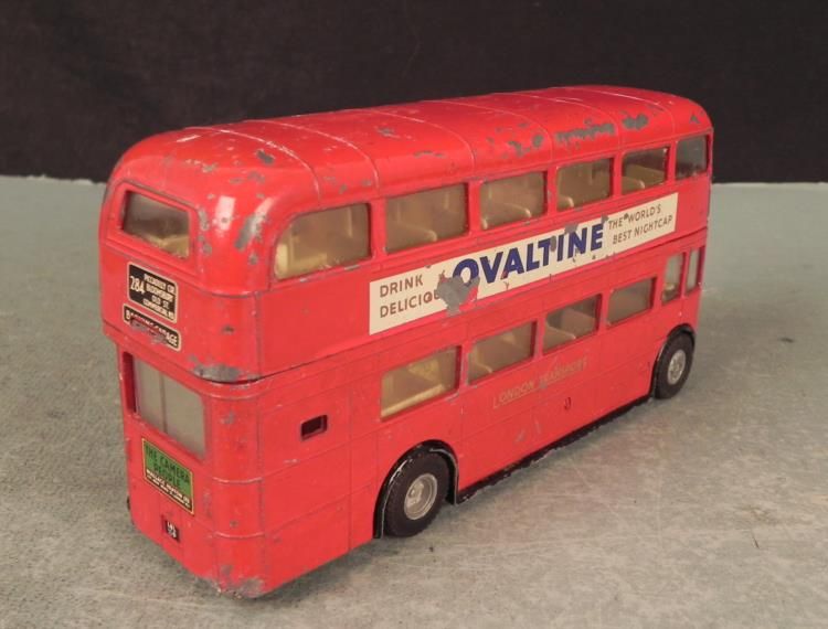 SPOT-ON LONDON TRANSPORT ROUTEMASTER BUS-"OVALTINE" #145 BY AEC-RED W/CR ME INTERIOR GREAT LONDON CAST METAL DOUBLE DECKER BUS-1960 VINTAGE