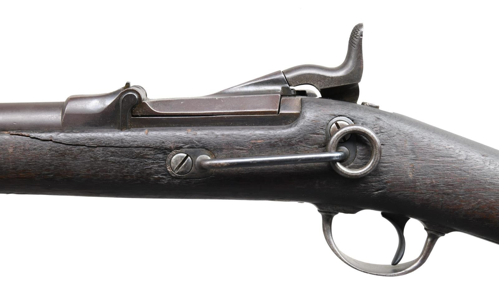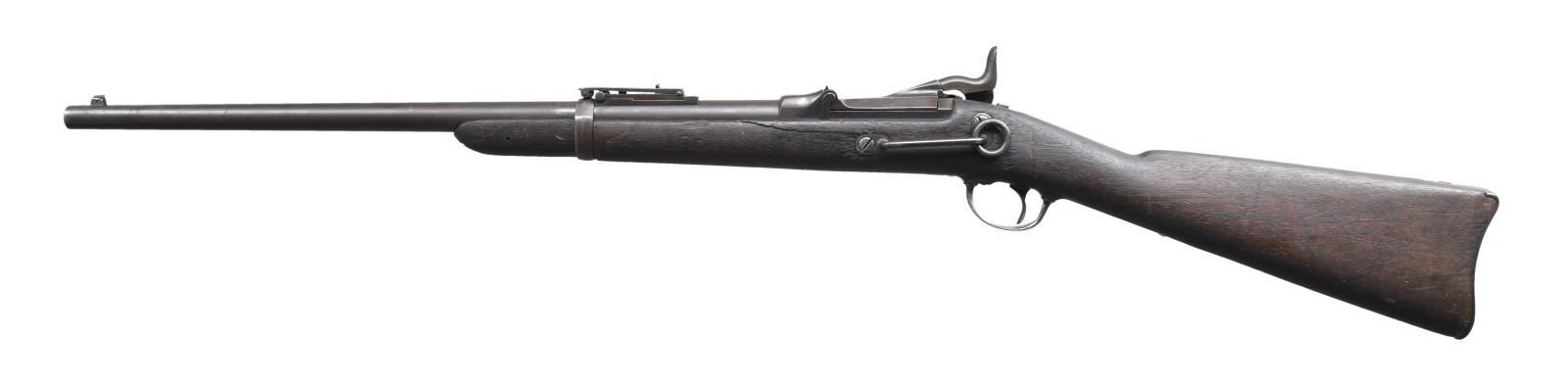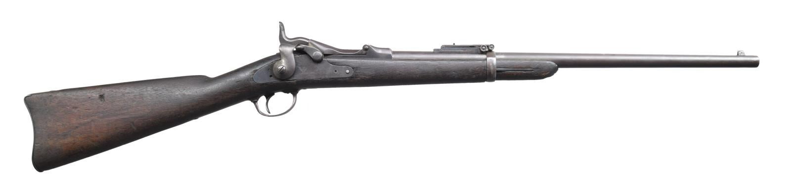 Cal. 45-70. S# 34764. Bbl. 22". Pinned blade front sight w/ replacement Buffington rear sight. 1873 dated high arch breech block. US Springfield marked lock. Band fastened long comb replacement carbine stock w/ trapdoor buttplate having saddle ring & bar on left side. CONDITION: metal has faded brown appearance. Wood has age darkened appearance showing heavy dents, scratches & marks w/ small chips around lockplate. Left side of stock has cracks extending from saddle ring bar forward into the forearm. Bore retains intact worn rifling. (01-24473/DS). ANTIQUE. $1,000-1,500.