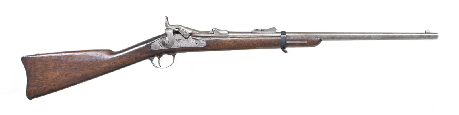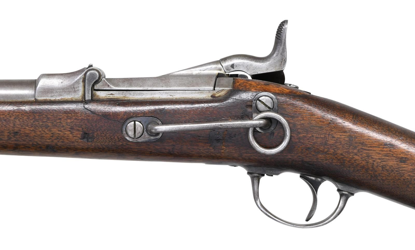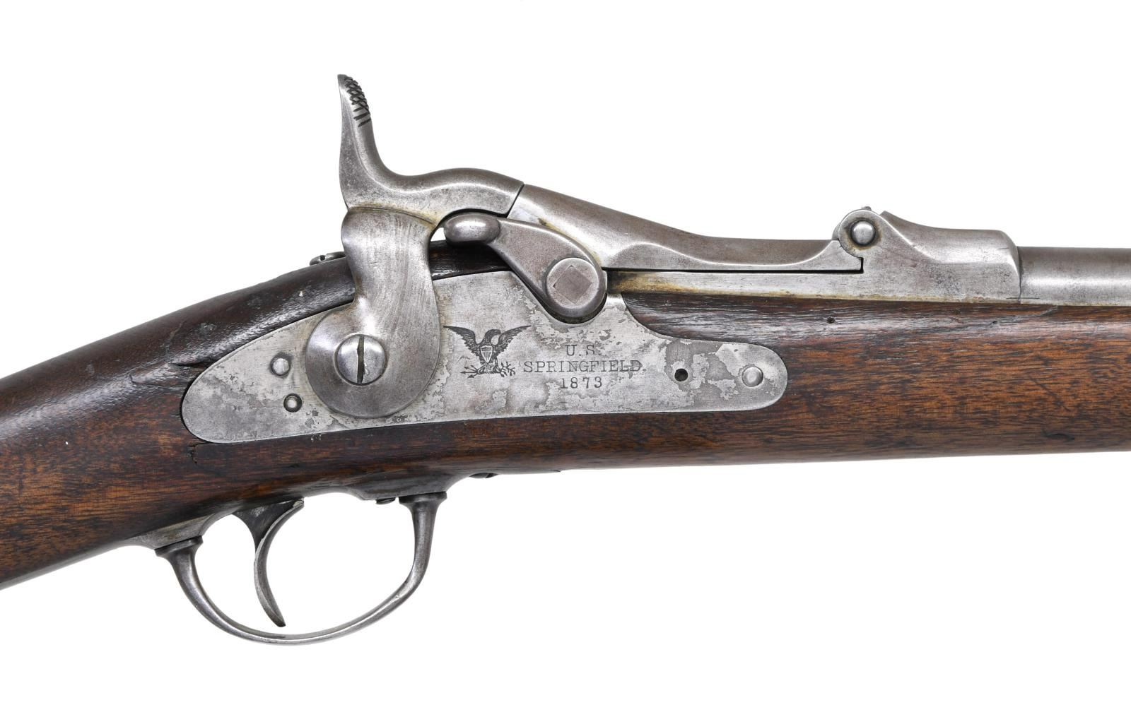 Cal. 45-70. S# 40577. Bbl. 22" with blade front sight and graduated leaf rear sight. High-arch breech block. 1873-dated lockplate. Proper band-fastened short-comb carbine stock with saddle ring and bar on the left side. CONDITION: metal has a cleaned gray appearance. Sanded and refinished stock shows wear with dents and handling marks. Stock is chipped around the saddle ring bar, top tang, and lock. Cracks extend from the lockplate to the top tang and forward of both saddle ring bar screws. The lightly pitted bore retains intact rifling. PROVENANCE: the collection of Curtis H. Halvorson. (01-24564/DS). ANTIQUE. $1,000-1,500.