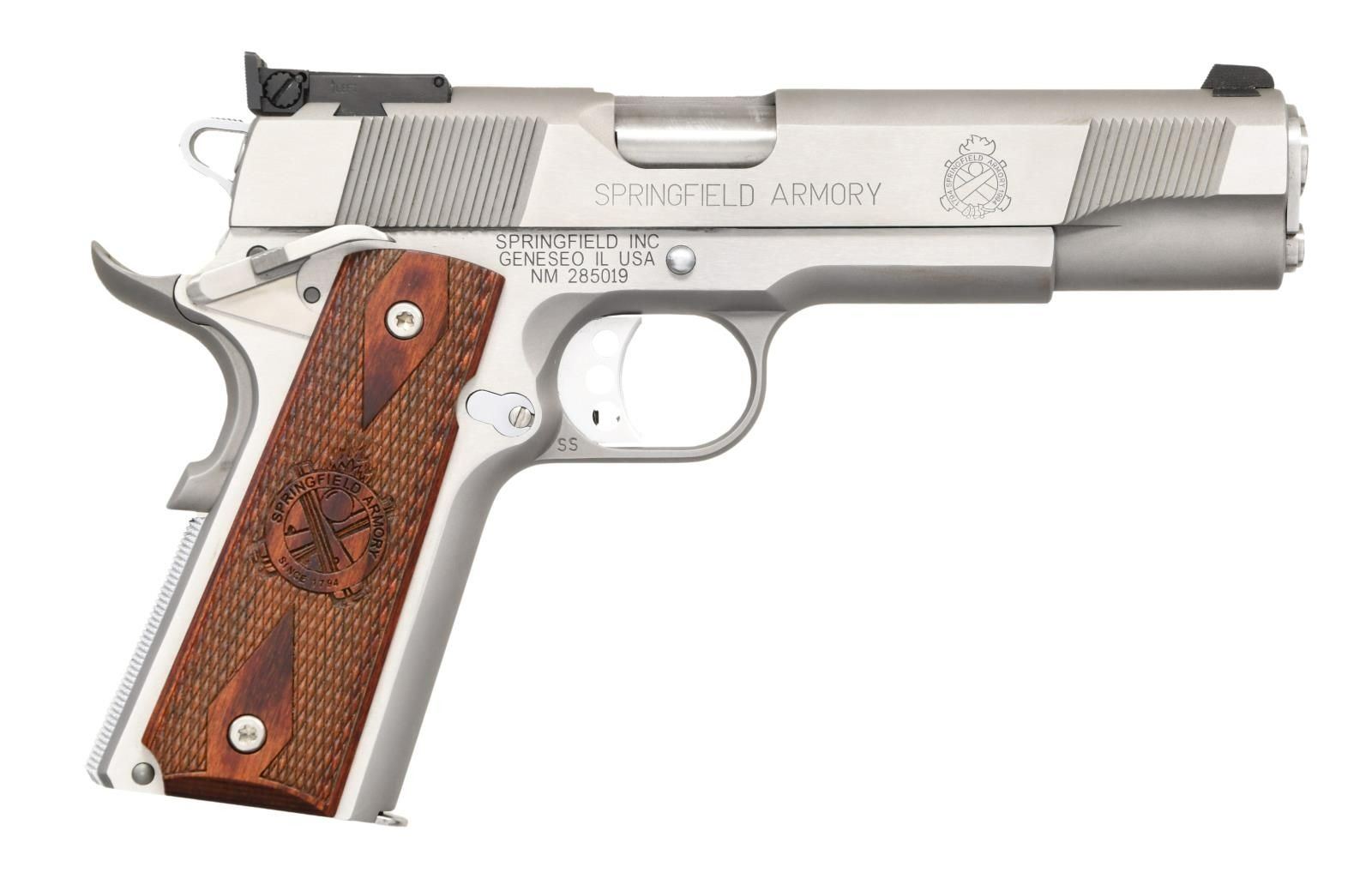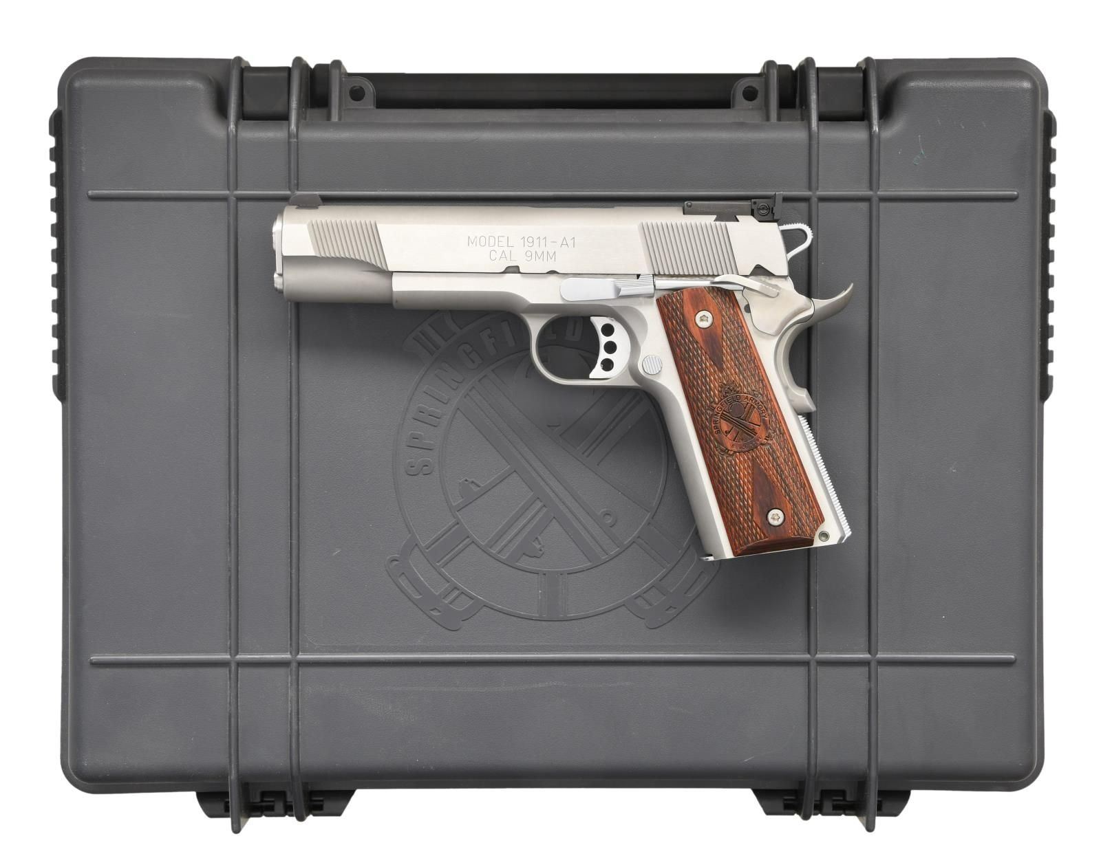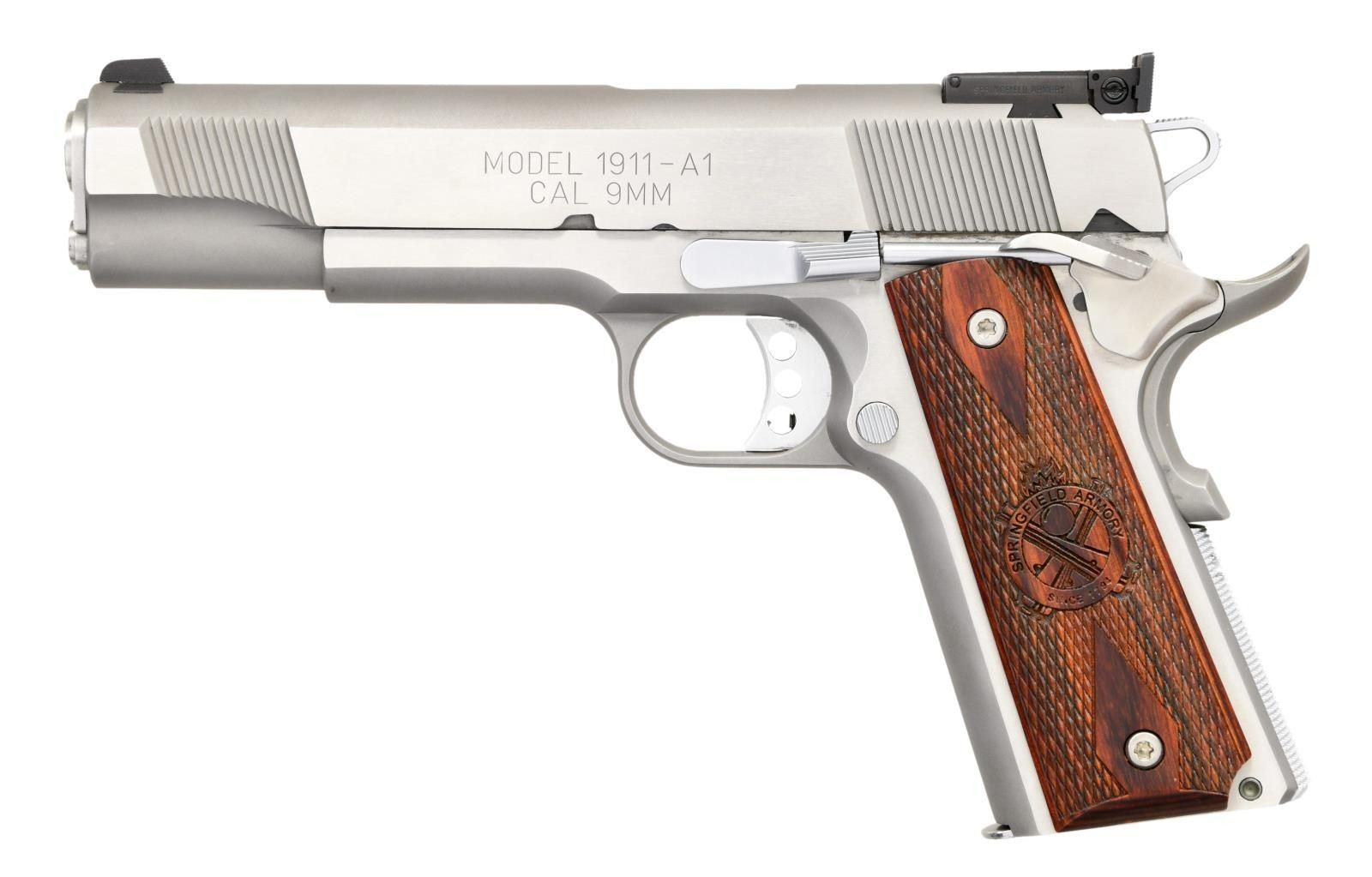 PISTOL. Cal. 9mm Luger. S# NM285019. Bbl. 5". Serrated blade front sight. Adjustable rear sight. Stainless finish. Extended ambi safety. Extended beavertail grip safety. Checkered Cocobolo grips w/ Springfield Armory logo. MAGS: 1-9 rd. UNATTACHED ACCESSORIES: w/box. CONDITION: left side of frame & slide show a slide stop reassembly scratch. Metal otherwise shows some handling marks. Other aspects rate very good plus or better. PROVENANCE: The Collection of Gun Sport Ltd owned by Jon R. Thomas. (23-4498/MJC). MODERN. $800-1200.
