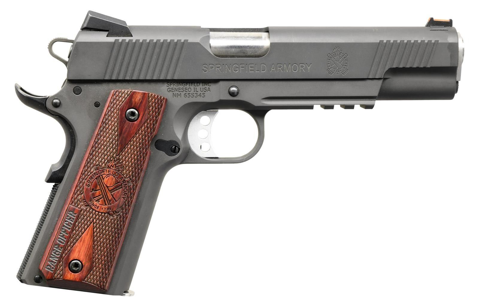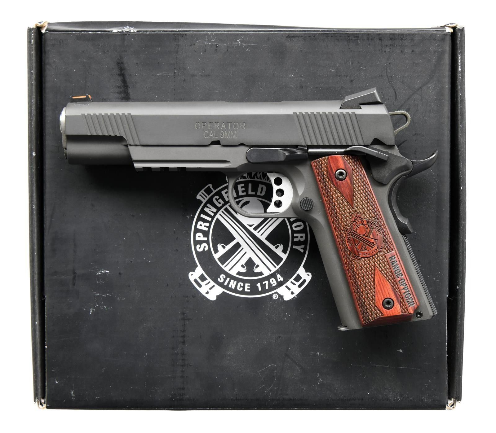 SEMI AUTO PISTOL. Cal. 9mm Luger. S# NM655345. Bbl. 5". Fiber optic front sight. White dot rear sight. Parkerized finish. Extended right hand safety. Extended beavertail grip safety. Frame has half length accessory rail. Checkered wood grips w/ Springfield logo. MAGS: 2-9 rd. UNATTACHED ACCESSORIES: matching numbered factory box w/ softcase, cable lock & manual. CONDITION: all aspects near excellent. PROVENANCE: The Collection of Gun Sport Ltd owned by Jon R. Thomas. (23-4040/MJC). MODERN. $500-800.