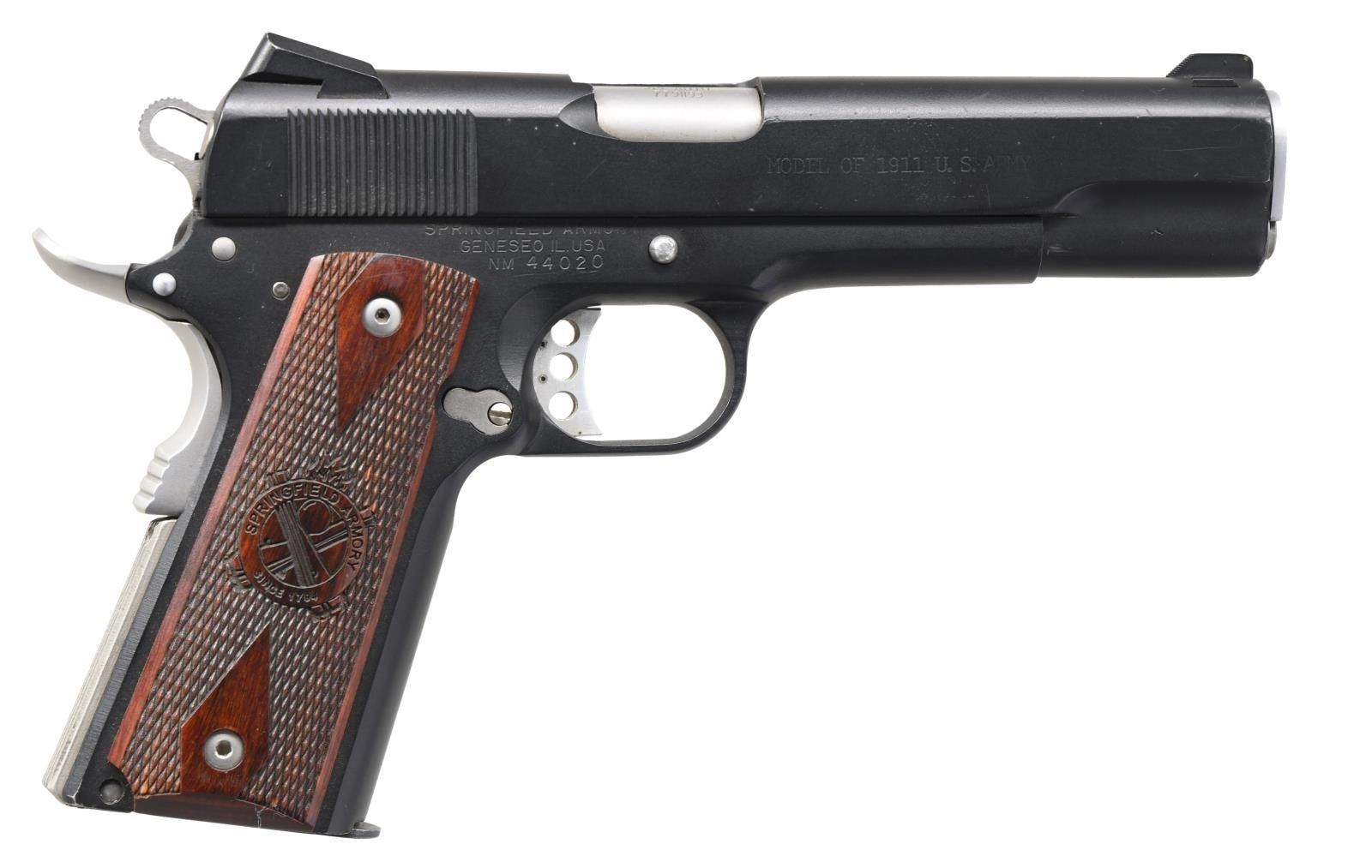 Cal. 45 ACP. S# NM44020. Bbl. 5". Blade front sight. Novak rear sight. Custom 1911 style pistol assembled using Springfield Armory Inc. slide & frame. Bbl. appears to be post war USGI & is marked '.45 AUTO 7791193". Extended slide stock & beavertail grip safety. Grip safety, trigger, hammer backstrap & slide stop are all brightly finished. Slide & frame have matte black finish. Checkered Springfield Armory Inc. hardwood grips. MAGS: 1-7 rd. Colt mfg. CONDITION: grips show a couple chipped points & some handling marks. Bright parts show light handling wear & some minor oxidation. Frame & slide retain 92% black enamel refinish w/ some pitting beneath the finish, edge & handling wear. Bore is dirty & shows some light pitting but may clean up better. (23-6910/MJC). MODERN. $700-1000.
