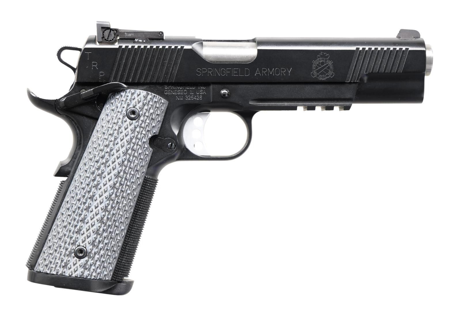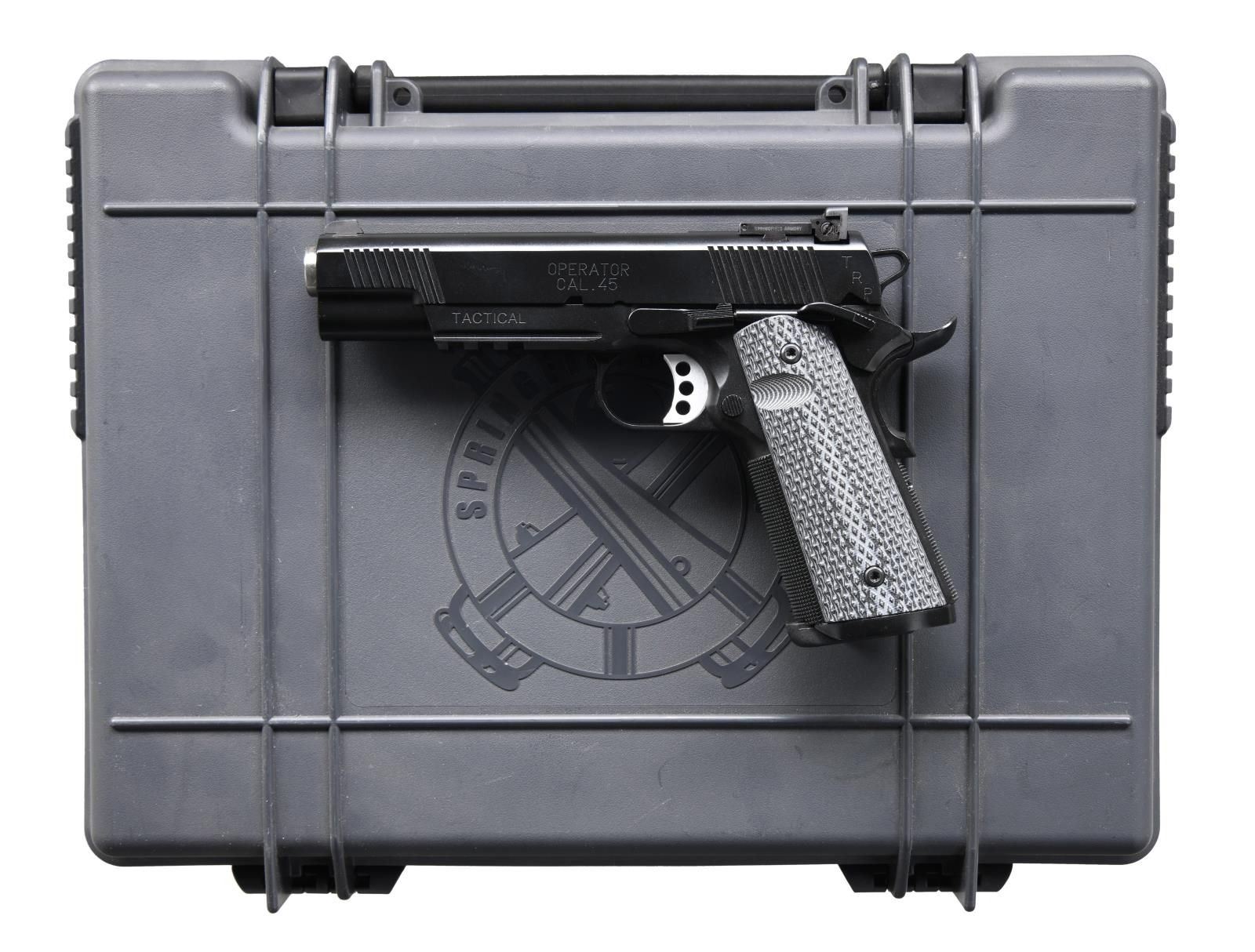 PISTOL. Cal 45 ACP. S# NM325426. Bbl. 5". Three dot night sights w/ adjustable rear. Tactical style 1911 based on the Springfield Professional model that was adopted by the FBI. Armory Kote black finish. Extended ambi safety. Extended beavertail grip safety. Frame has stippling on both straps & half length accessory rail. G10 grips w/ right hand thumb cutout. MAGS: 2-7 rd. UNATTACHED ACCESSORIES: matching numbered factory hardcase w/ dual mag pouch, holster, manual, paperwork, bore brush & allen wrench. CONDITION: all aspects near new in the box. PROVENANCE: The Collection of Gun Sport Ltd owned by Jon R. Thomas. (23-4004/MJC). MODERN. $500-900.