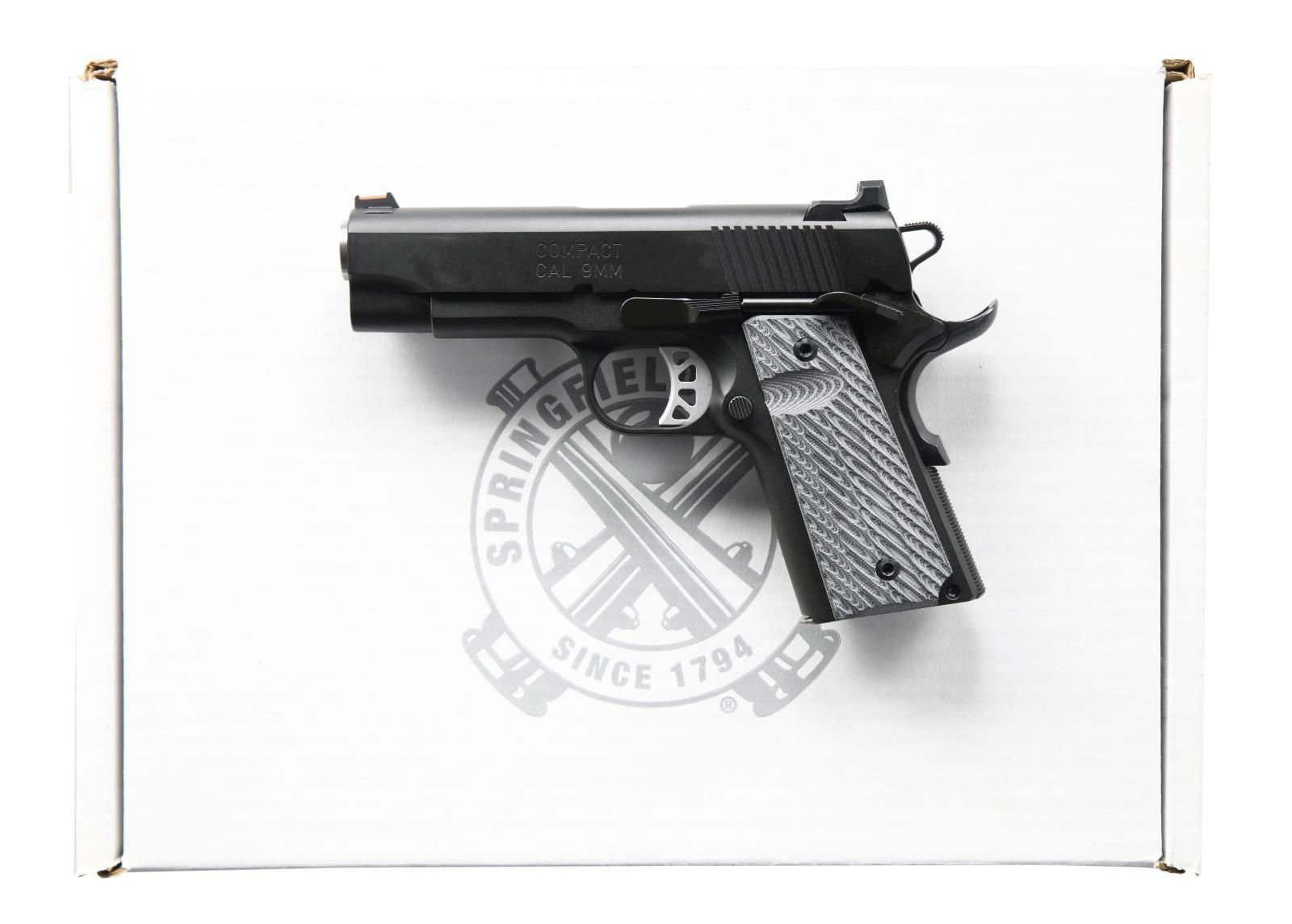Cal. 9mm Luger. S# LW169077. Bbl. 3 3/4". Fiber optic front sight. White dot rear sight. Lightweight compact range officer pistol. Parkerized finish. Extended ambi safety. Extended beavertail grip safety. Thin G10 grips. MAGS: 2-8 rd. UNATTACHED ACCESSORIES: matching numbered factory box w/ softcase, cable lock, gun oil, manual, & paperwork. CONDITION: all aspects near new, in the box. PROVENANCE: the Collection of Gun Sport Ltd owned by Jon R. Thomas. (23-3000/MJC). MODERN. $500-800.
