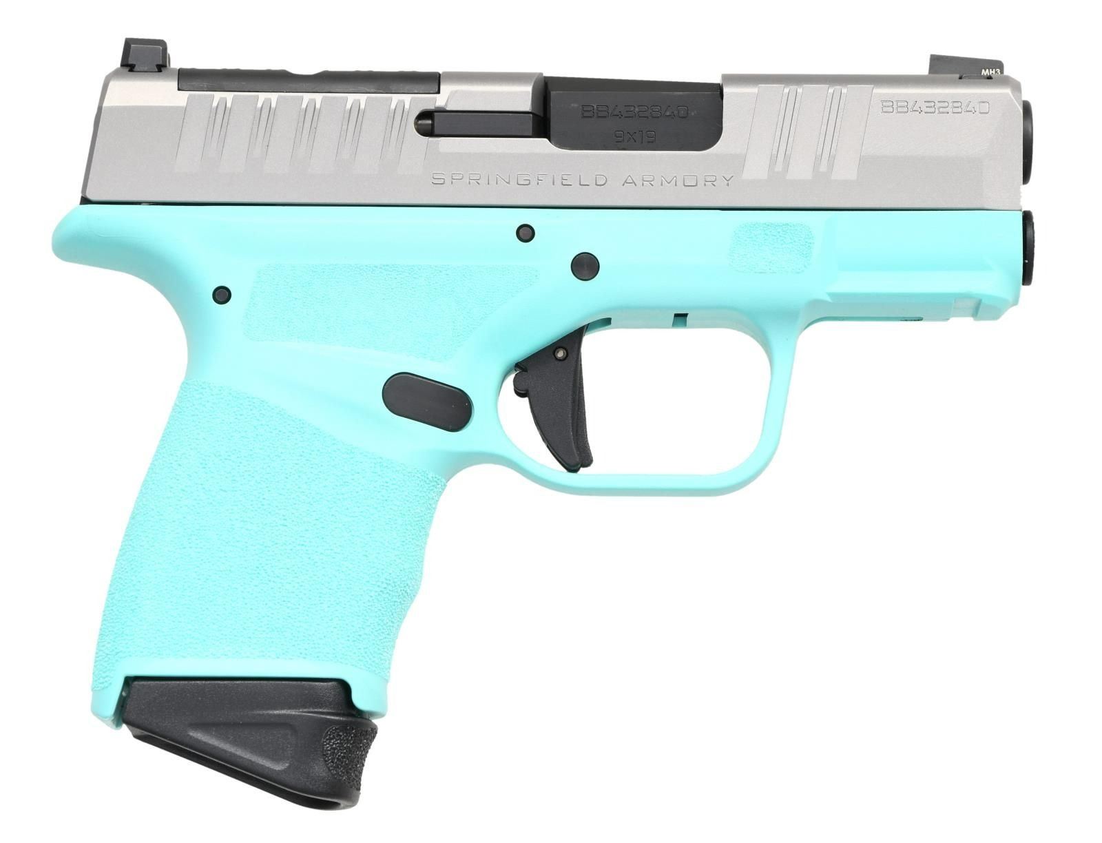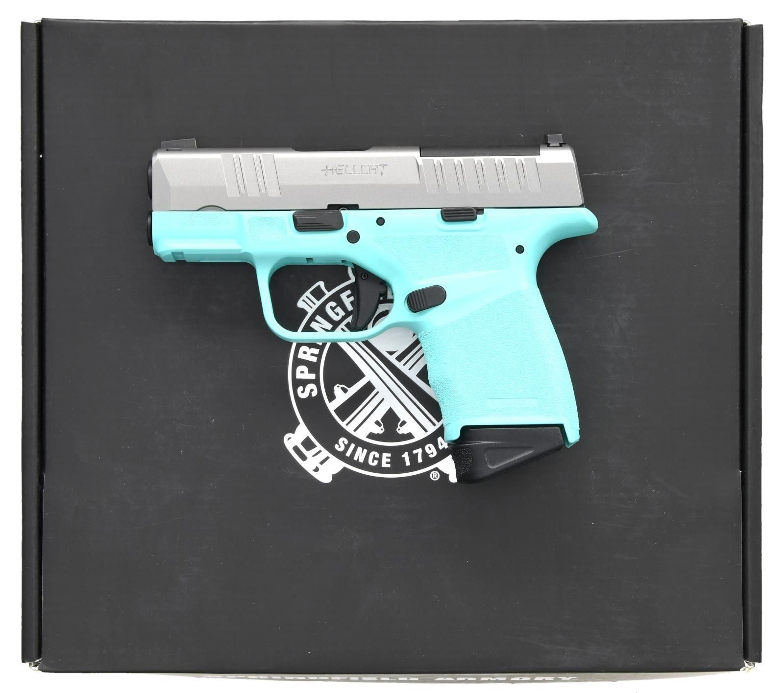 Cal. 9mm Luger. S# BB432840. Bbl. 3". Large dot tritium front sight. White outline U-notch rear sight. Stainless slide w/ factory RMR cut for reflex sight mounting. Robin's egg finished polymer frame w/ accessory rail. MAGS: 2-11 rd. UNATTACHED ACCESSORIES: matching numbered factory box w/ cable lock, manual, factory test target, mag loader, & spare mag baseplate. CONDITION: all aspects near new, in the box. PROVENANCE: the Collection of Gun Sport Ltd owned by Jon R. Thomas. (23-2765/MJC). MODERN. $400-600.