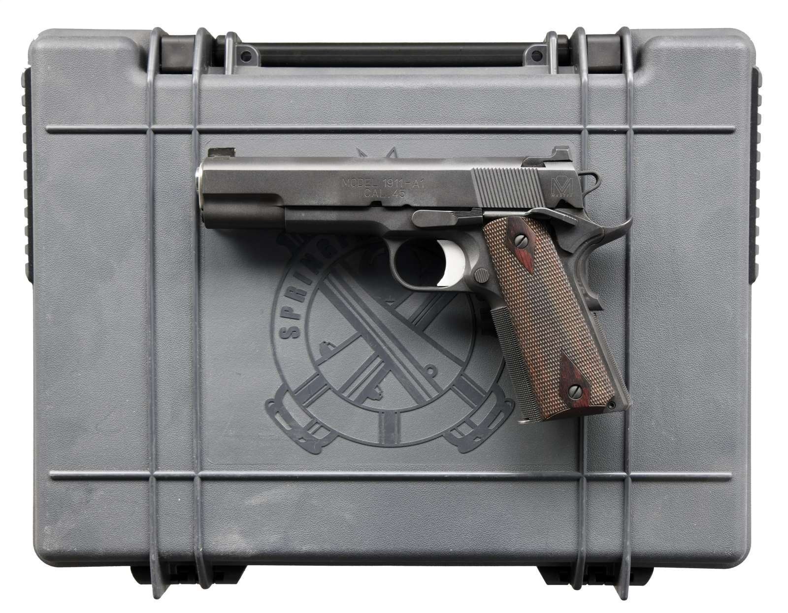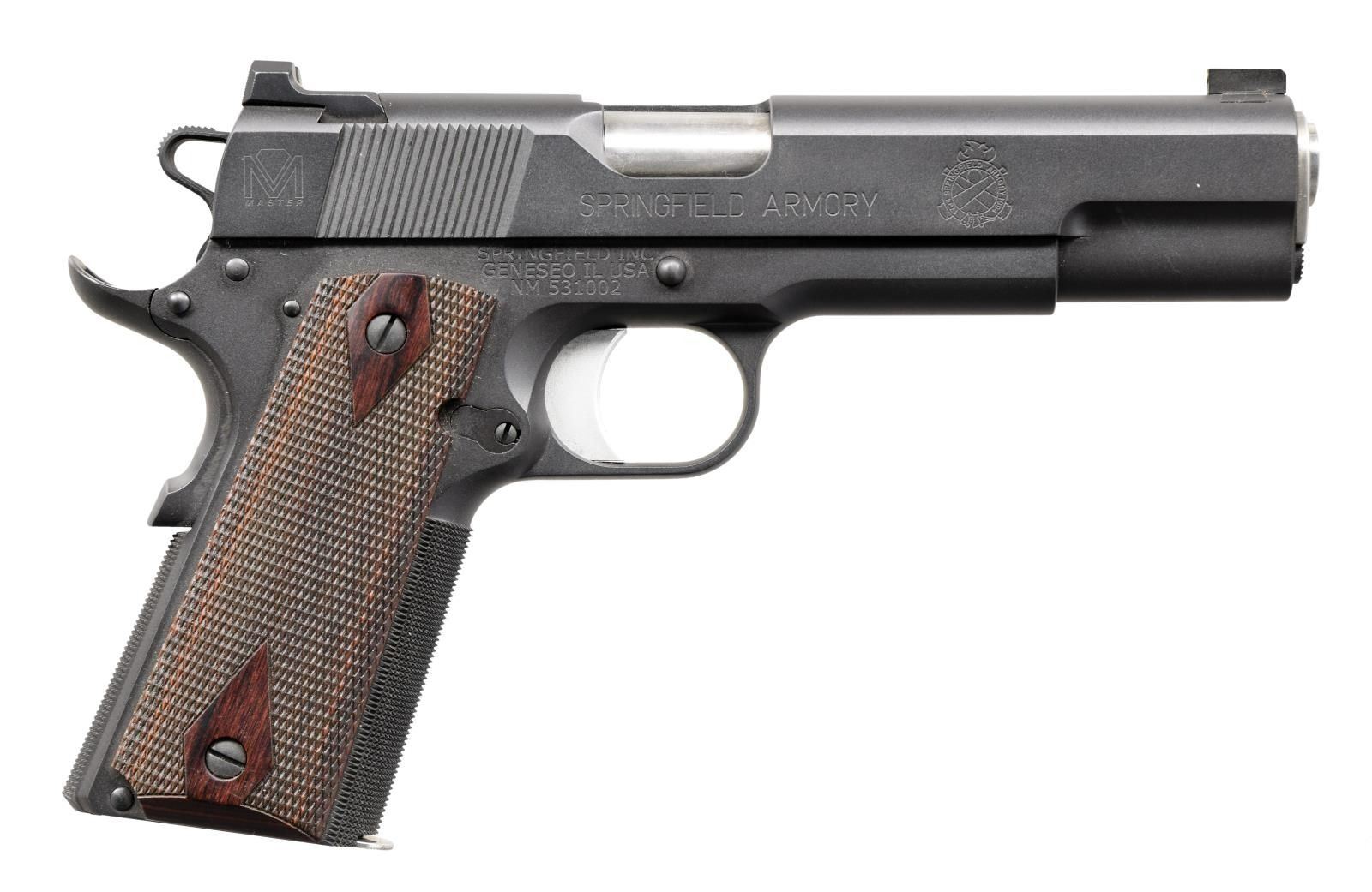 AFICIONADO SEMI AUTO PISTOL. Cal. 45 ACP. S# NM531002. Bbl. 5". Gold bead front sight. SAC Tactical rear sight. Limited edition Springfield Armory Master Class 1911A1 w/ only 100 mfg. Parkerized finish. Extended right hand safety. Extended beavertail grip safety. Front & backstrap have 28 LPI checkering. Checkered rosewood grips. MAGS: 1-7 rd. UNATTACHED ACCESSORIES: w/box. CONDITION: all aspects near excellent. PROVENANCE: The Collection of Gun Sport Ltd owned by Jon R. Thomas. (23-4035/MJC). MODERN. $1000-1500.