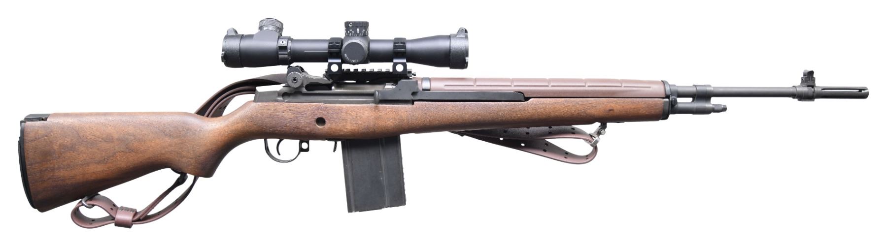 RIFLE W/ LEUPOLD MK 12 MOD 1 SCOPE. Cal..308. S# 242787. Bbl. 25" including solid bottom flash suppressor. Carbon steel barrel is marked "GENESCO, IL." National match type adjustable aperture rear sight. Blade front sight marked "NM". Gas cylinder and handguard ferrule have been unitized leaving the gas shut off functional. Round operating spring guide. The rifle has a Leupold MK 12 MOD1 tactical scope. The 2.5 X8 X 36mm optic has 1/2" click finger adjustable turrets. The elevation turret is also marked "5.56mm 77gr.". Lighted reticle. Leupold flip up protective caps. A.R.M.S. picatinny rail scope mount attachment replaces clip guide. Walnut stock has the heavier forend profile. Front swivel has been changed to QD type. Stock has factory glass bedding. High quality Brownell's synthetic military style sling. MAGS: 1-20 rd. Factory. CONDITION: Rifle exhibits very light wear and tiny handling marks showing a small amount of careful use. Very good bright shiny bore. PROVENANCE: from the estate of Jon Thomas GUNSPORT LTD. (25-1069/RW). MODERN. $1,750-2,500.