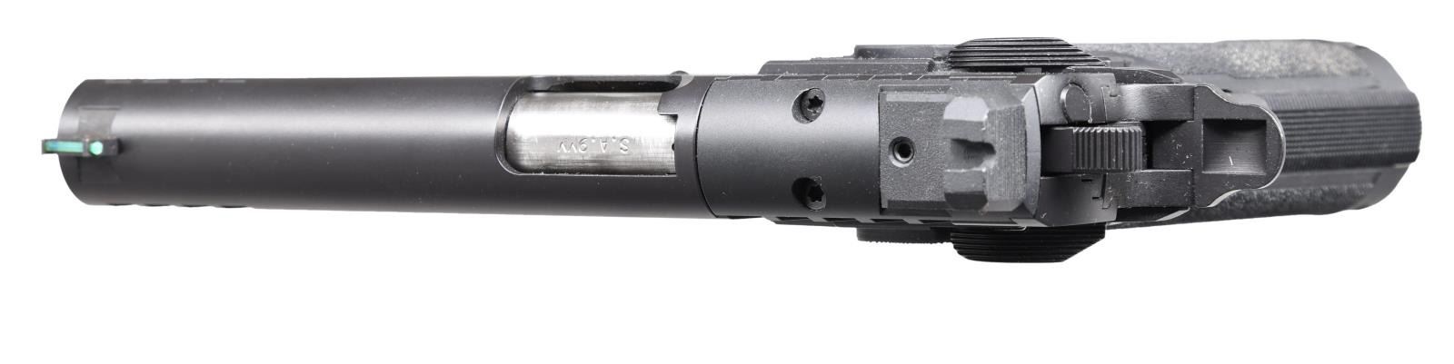 Cal. 9mm Luger. S# NMH11610. Bbl. 5". Fiber optic front sight. Blacked-out u-notch rear sight. Slide has a cutout for the RMR plate for reflex sight mounting. 2011-style pistol. Extended ambi safety. Extended beavertail grip safety. Matte black finish. Frame has picatinny accessory rail. Black polymer grips. MAGS: 1-17 rd. & 1-20 rd. Total of 2. UNATTACHED ACCESSORIES: matching-numbered factory box w/ softcase, manual, cable lock, Allen wrench, & RMR plate. CONDITION: all aspects are near excellent. PROVENANCE: the collection of Gun Sport Ltd., owned by Jon R. Thomas. (23-4329/MJC). MODERN. $1,200-1,600.