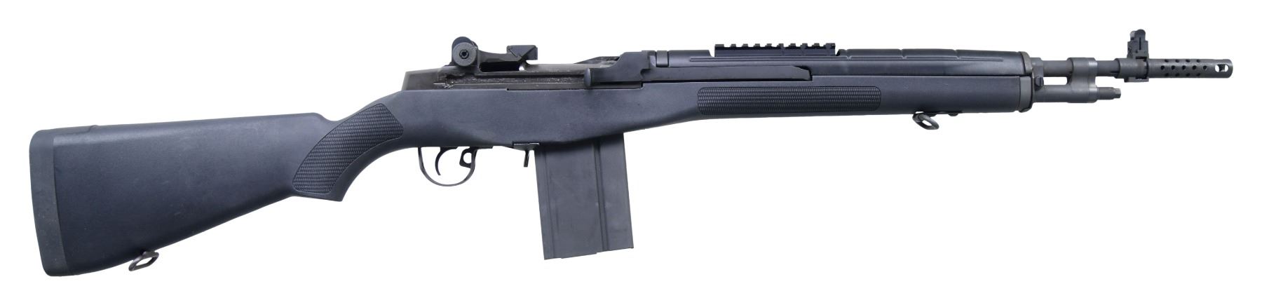 Cal. 308 WIN. S# 423312. Bbl. 21" including proprietary muzzle brake. Rifle is in a "scout" configuration and has a muzzle brake extending 3" beyond front sight. Standard aperture rear sight and blade front sight w/ protective ears. Rifle is equipped with a Picatinny rail forward of the receiver for mounting a scout type scope. This handy rifle has a black synthetic stock and a solid black butt pad. MAGS: 4-20 rd. 1-5rd. all marked "Springfield". UNATTACHED ACCESSORIES: Original factory owners manual and paperwork. "LULA" mag. loader. Black nylon "Springfield" padded case. Factory trigger lock. CONDITION: all aspects near excellent except bore which shows light wear and frosting. (25-806/RW). MODERN. $ 1,000- 1,500.