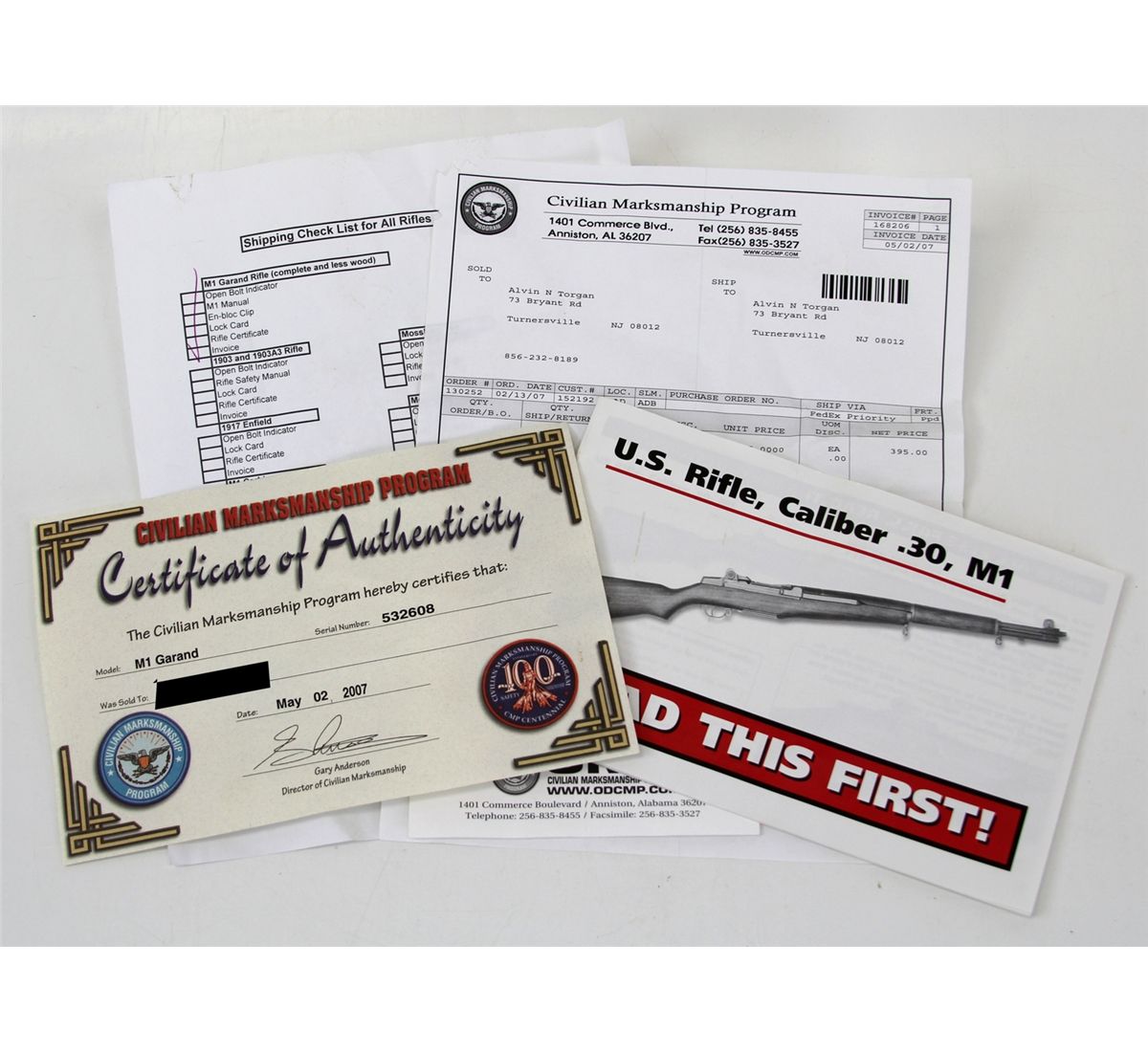 SPRINGFIELD ARMORY US M-1 GARAND RIFLE CMP Springfield Armory US M-1 Garand rifle, complete with Civilian Marksmanship Program COA, instructions, and invoice. Type: Rifle Manufacturer: Springfield Model: M-1 Caliber / Gauge: .30-06 Serial Number: 532608 Condition: Bore is very good. Finish is about 75%, and stock is very good.