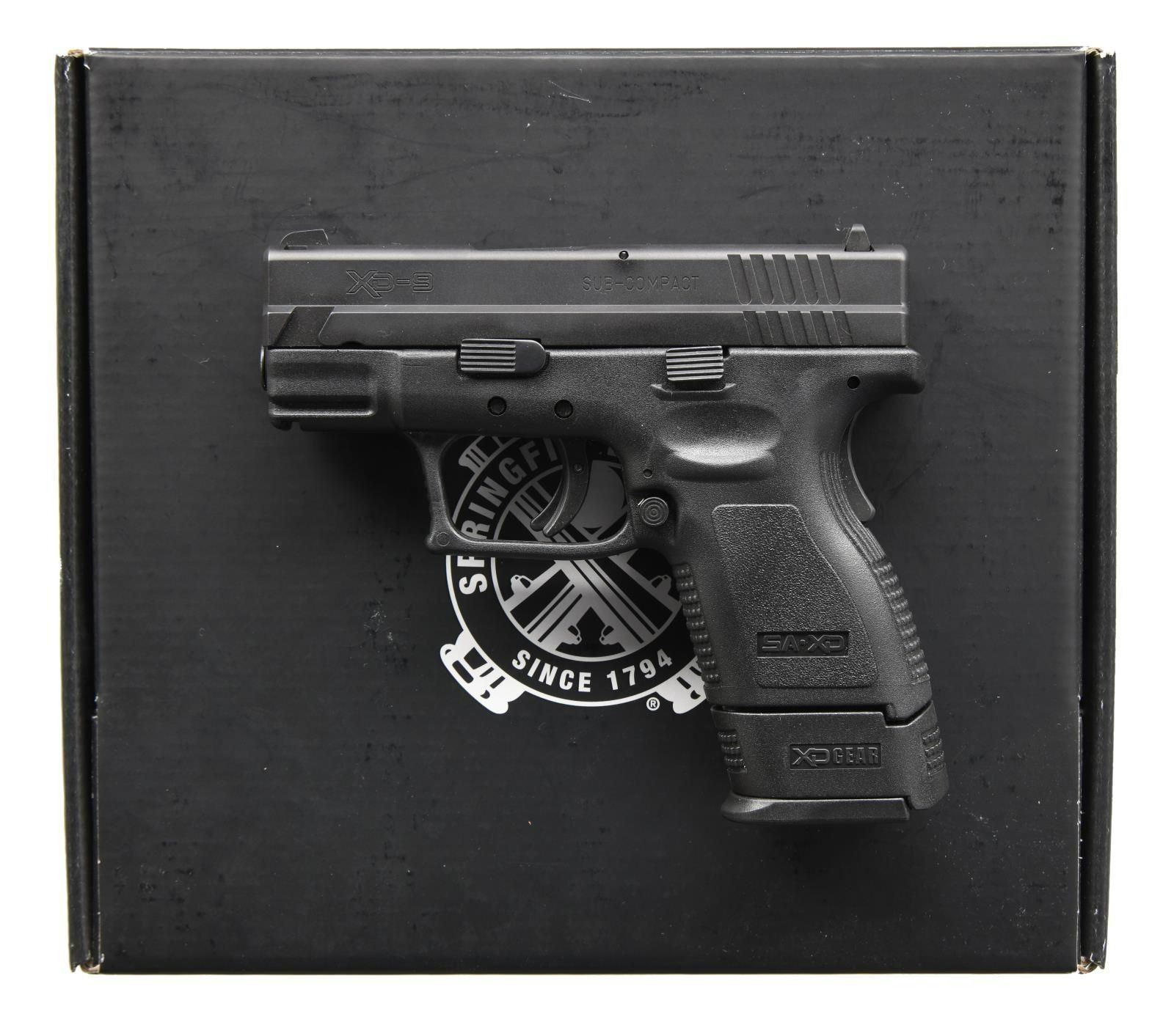PISTOL. Cal. 9mm Luger. S# BA225573. Bbl. 3". Three dot sights. Matte black finish. Ambi mag release. Polymer frame w/ grip safety & accessory rail. MAGS: 1-10 rd. w/ finger extension. UNATTACHED ACCESSORIES: w/ box. CONDITION: all aspects rate very good plus or better w/ slide showing some light handling marks. PROVENANCE: The Collection of Gun Sport Ltd owned by Jon R. Thomas. (23-4528/MJC). MODERN. $300-500.