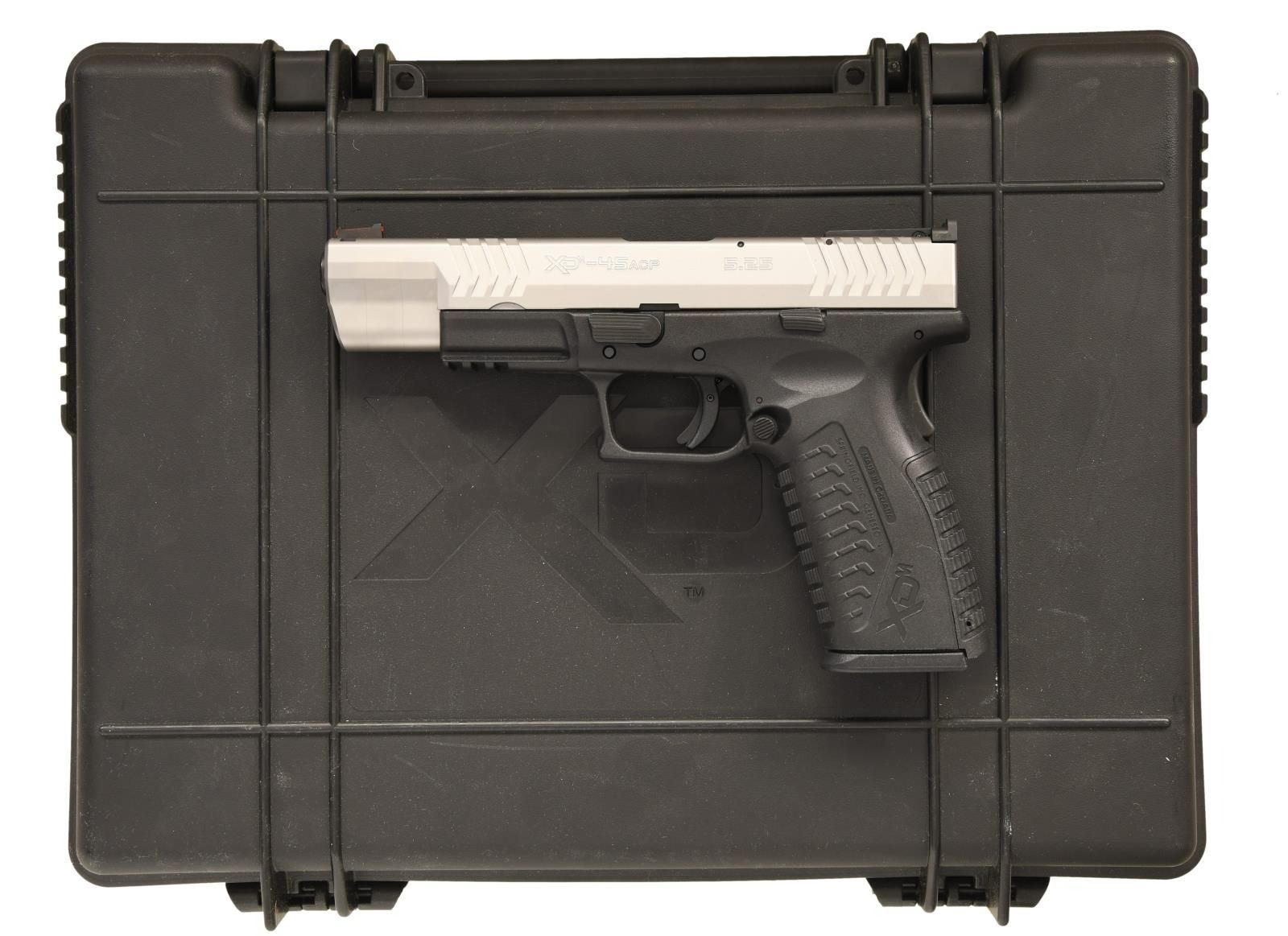 Cal. 45 ACP. S# MG639652. Bbl. 5 1/4". Fiber optic front sight. Adjustable rear sight. Stainless ported slide. Black polymer frame w/ accessory rail. MAGS: 3-13 rd. UNATTACHED ACCESSORIES: matching numbered factory hardcase w/ paperwork, manual, mag loader, holster, cable lock, dual mag pouch, & two grip straps. CONDITION: all aspects near new, in the box. PROVENANCE: the Collection of Gun Sport Ltd owned by Jon R. Thomas. (23-3069/MJC). MODERN. $500-800.